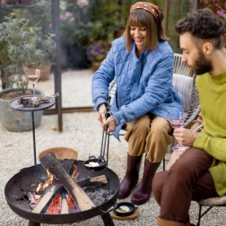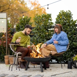 Izbaudiet vakarus pie atklātas uguns ar eleganto melno ugunskura bļodu, kas izceļas ar noturību pret augstām temperatūrām un ilgu kalpošanas laiku. Divi sānu rokturi nodrošina drošu pārnešanu, bet trijkājis ar aizsarguzgaļiem gādā par stabilitāti dažādās vietās.