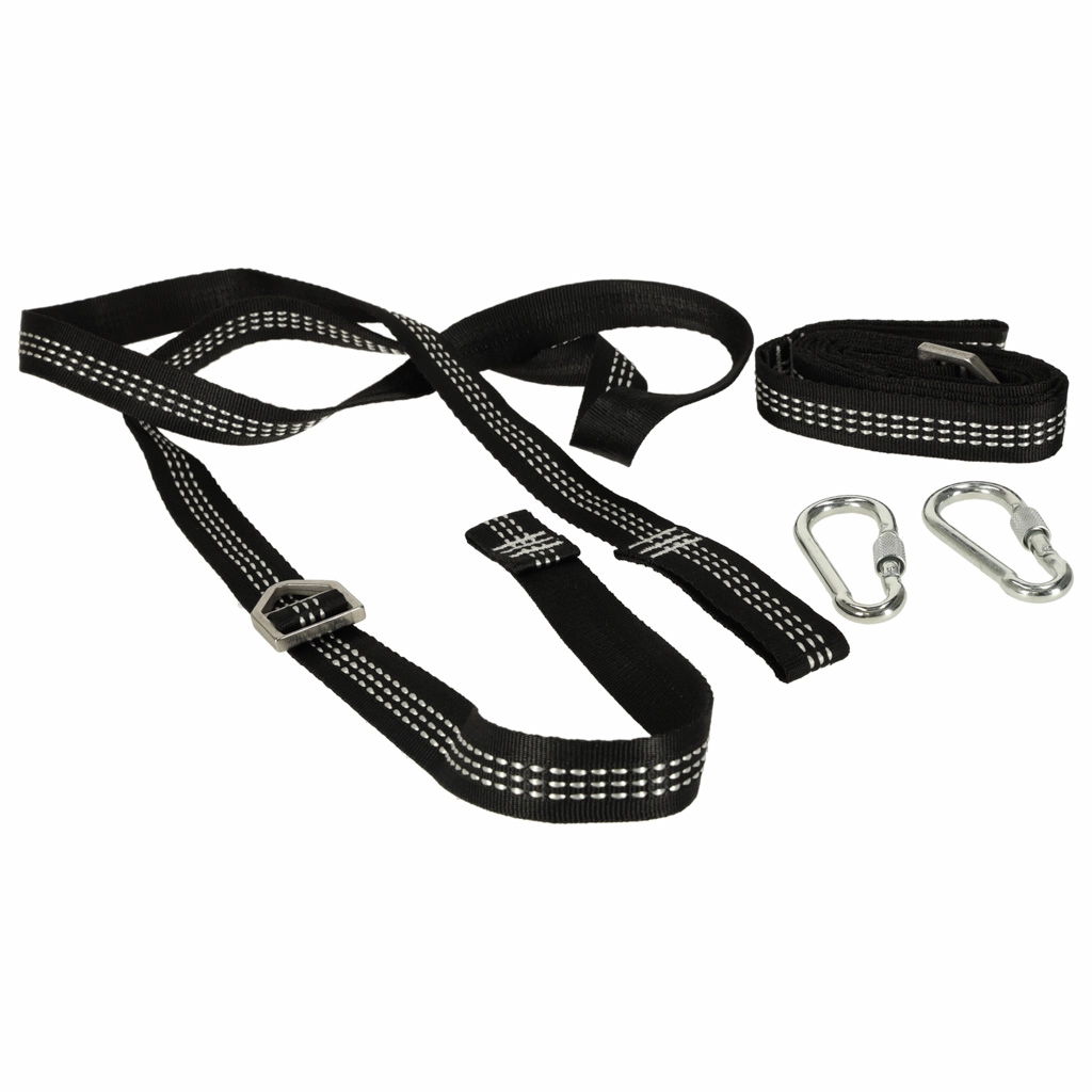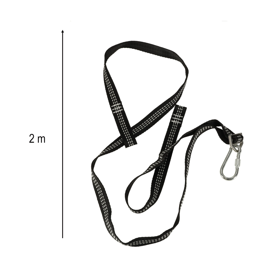 Ideāls montāžas komplekts visiem šūpošanās cienītājiem gan dārzā, terasē, gan iekštelpās. Komplektā ietilpst divas īpaši izturīgas 2 metrus garas siksnas un divas karabīnes ar maksimālo nestspēju 300 kg. Tas nodrošina stabilitāti un drošību pat intensīvas lietošanas laikā.