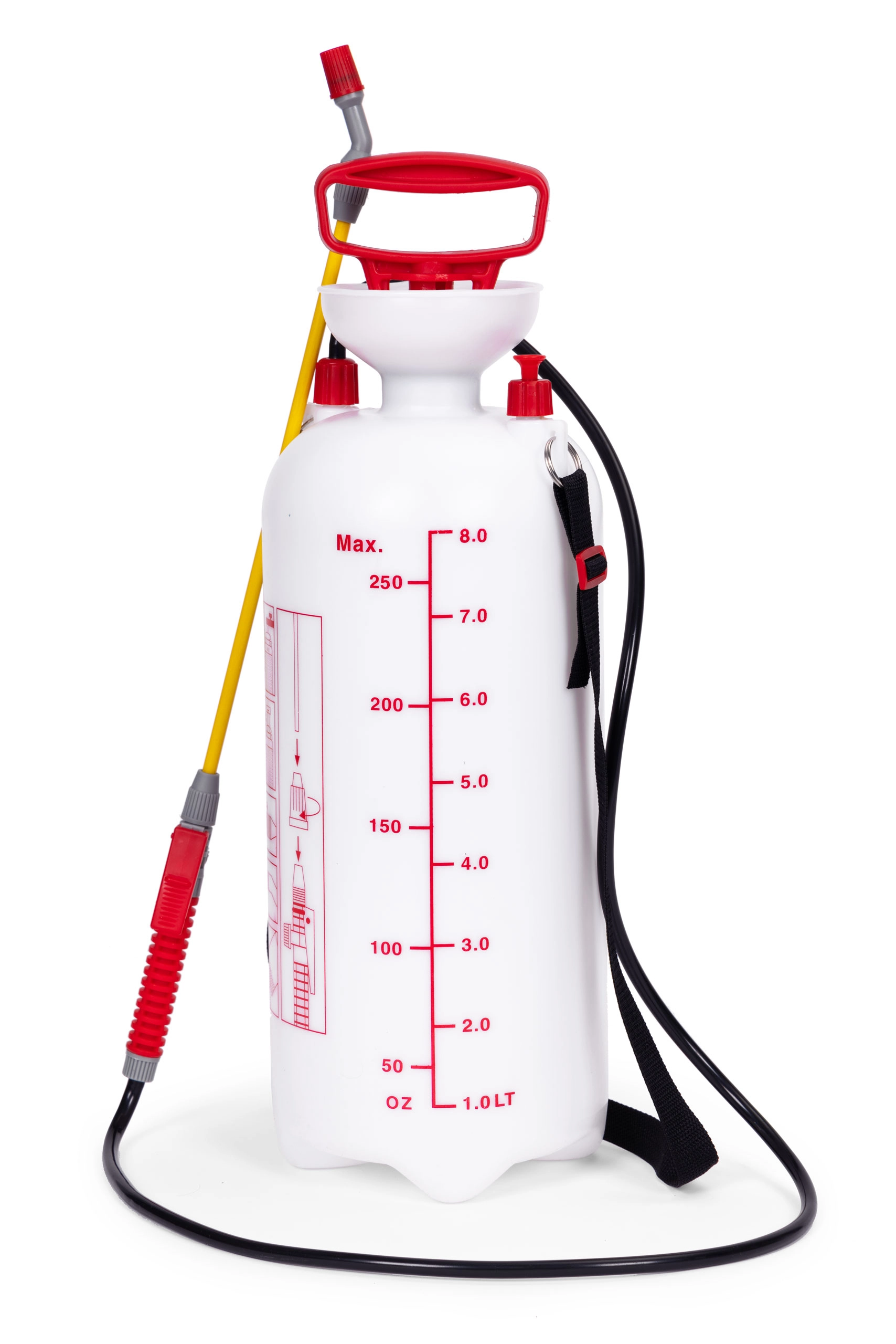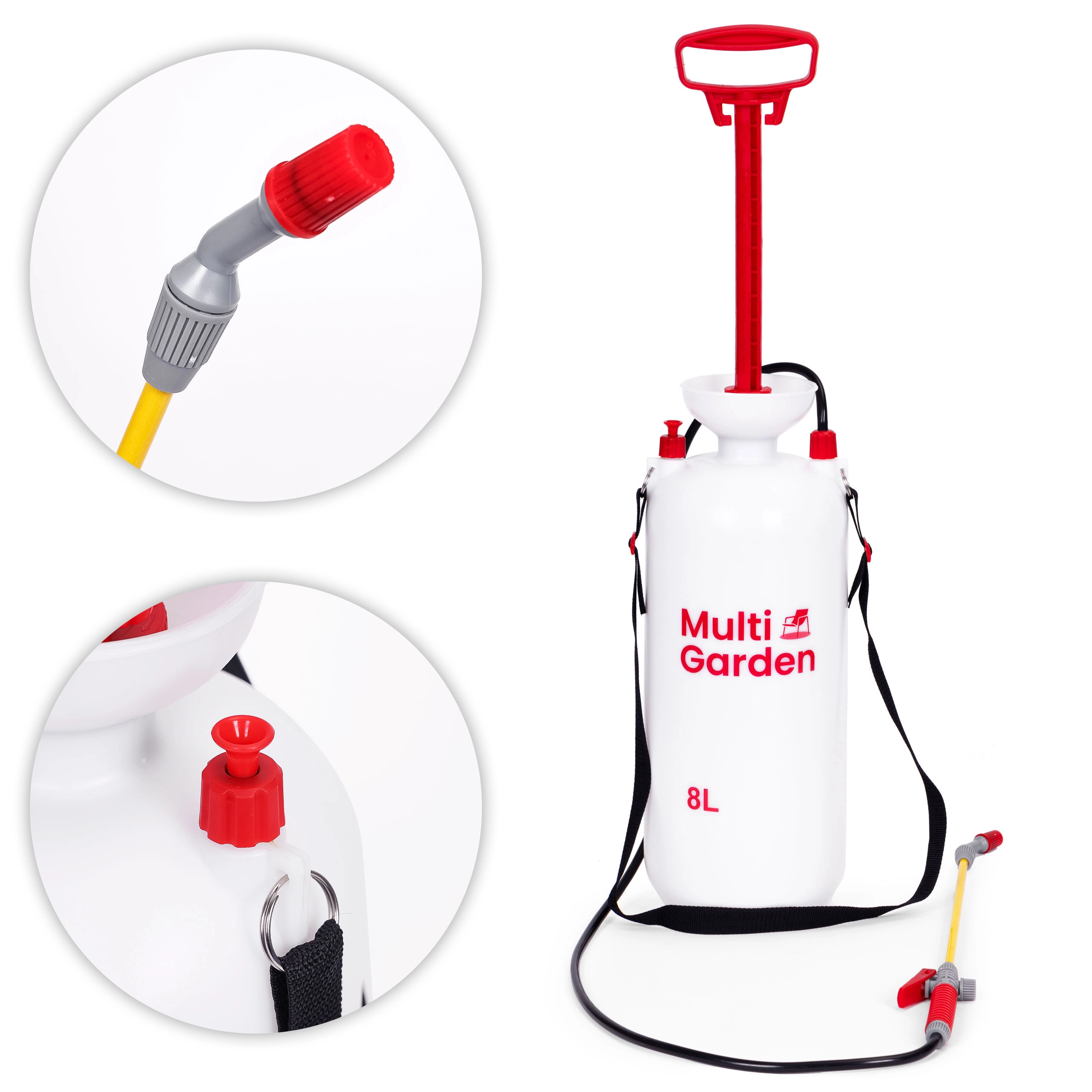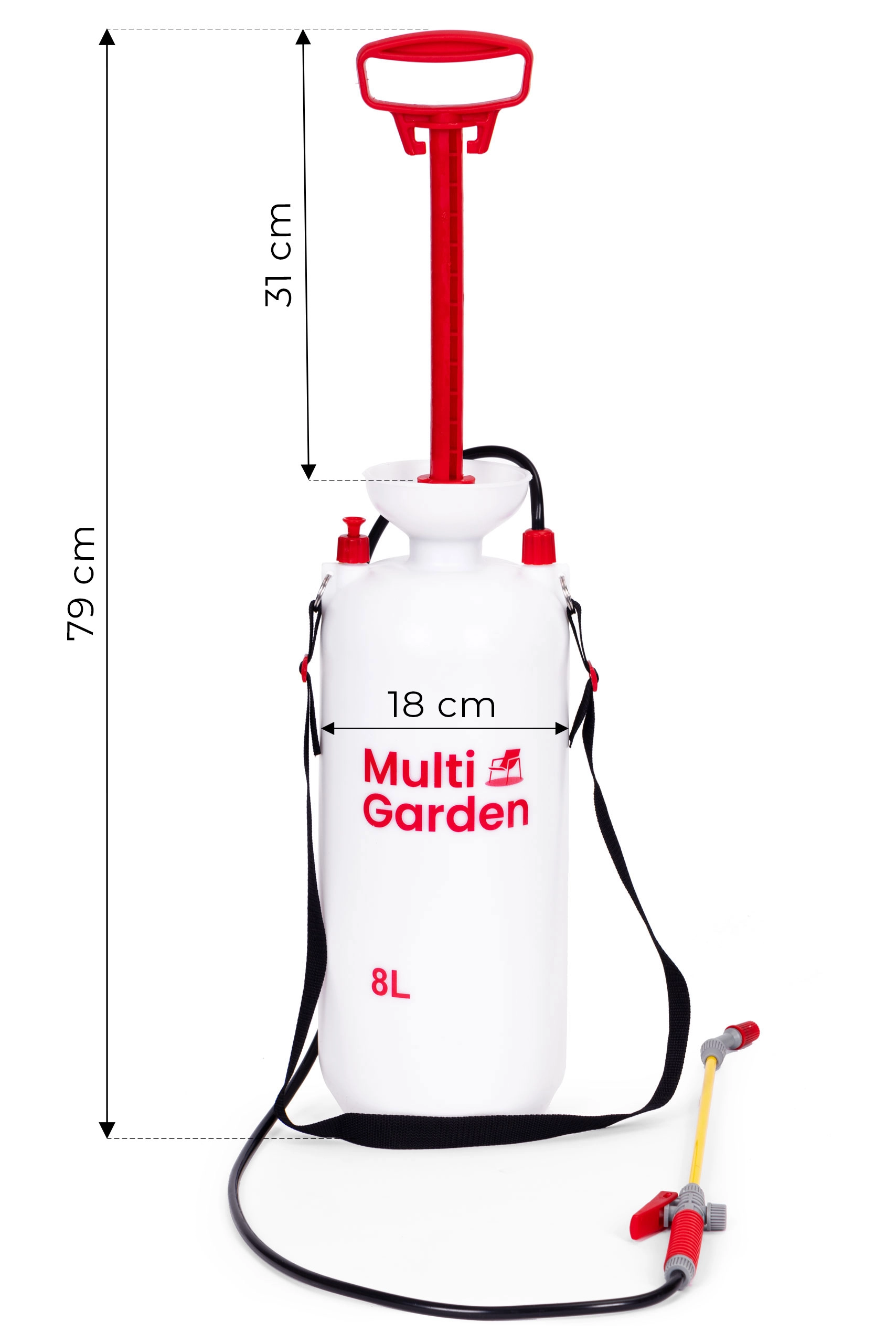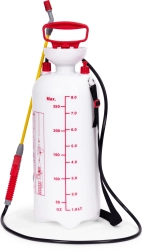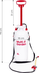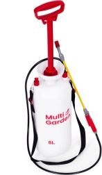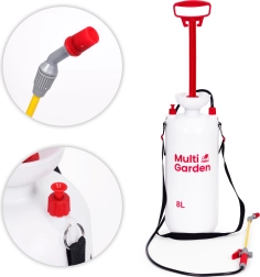 Praktisks 8 l spiediena smidzinātājs no zīmola MULTIGARDEN ērtai dārza kopšanai un mājas apkārtnes tīrīšanai. Tas piedāvā regulējamu sprauslu (plakana un koniska strūkla), garu šķiedrstikla laisti, virzuļa sūkni, drošības vārstu un mērogu uz tvertnes. Pateicoties ergonomiskam rokturim un regulējamai plecu siksnai, smidzinātāju ir ērti nest un lietot.