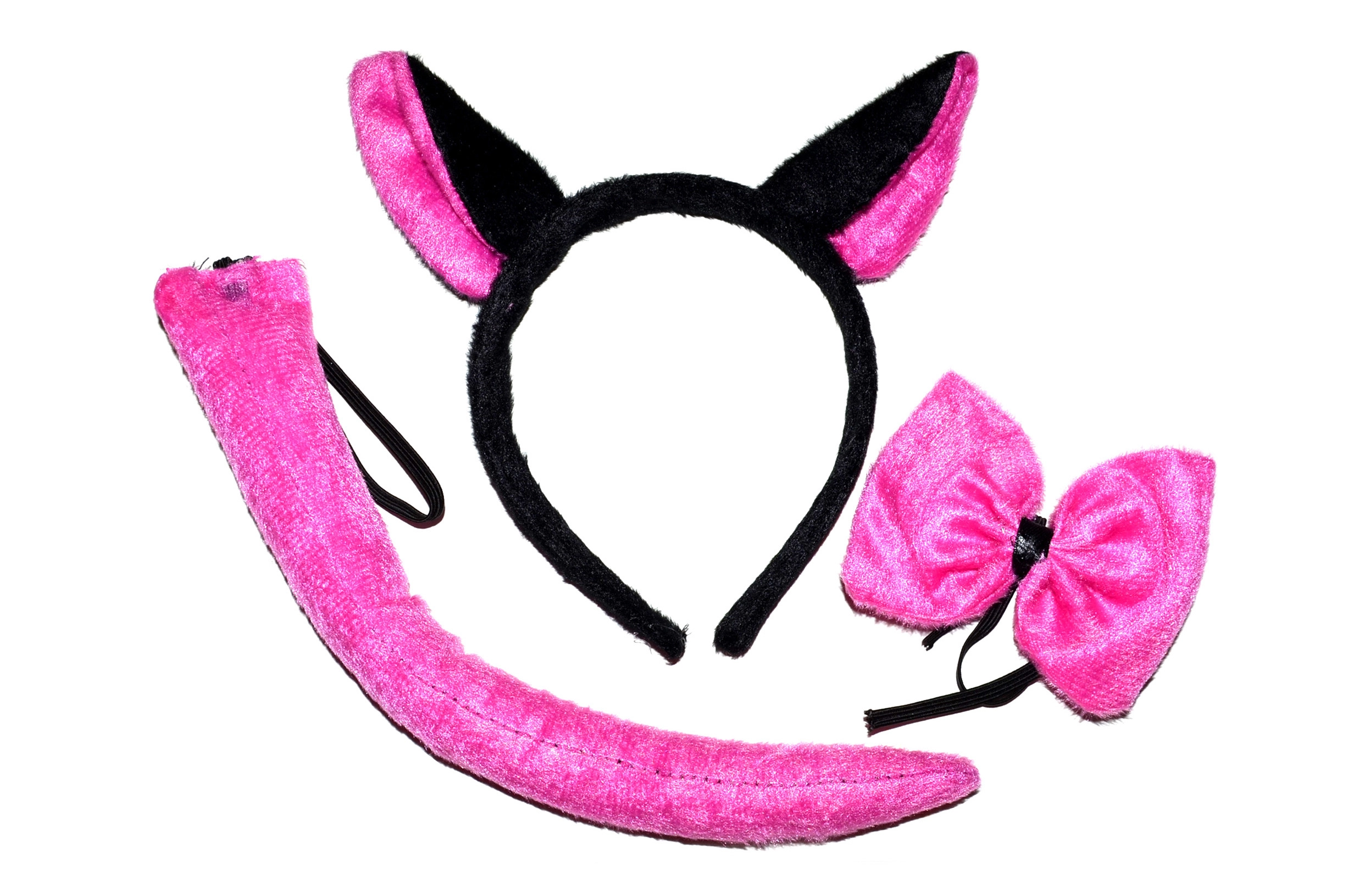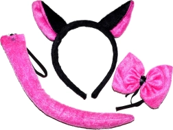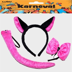 Komplektā atradīsiet visu nepieciešamo: stīpiņu ar kaķa austiņām, elegantu tauriņu kaklam un saskaņotu asti. Aksesuārus viegli kombinēt ar melnu krekliņu un legingiem – gatavs dažu minūšu laikā.