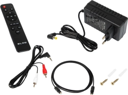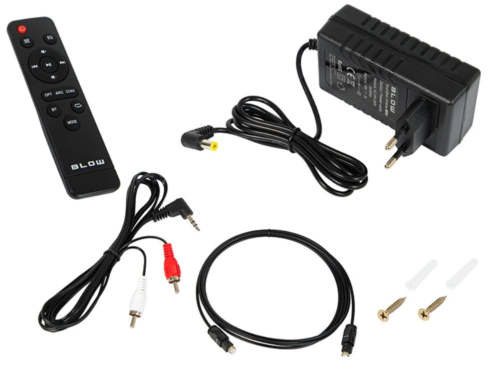 - skaņas josla, tālvadības pults, barošanas adapteris, kabeļi, montāžas piederumi