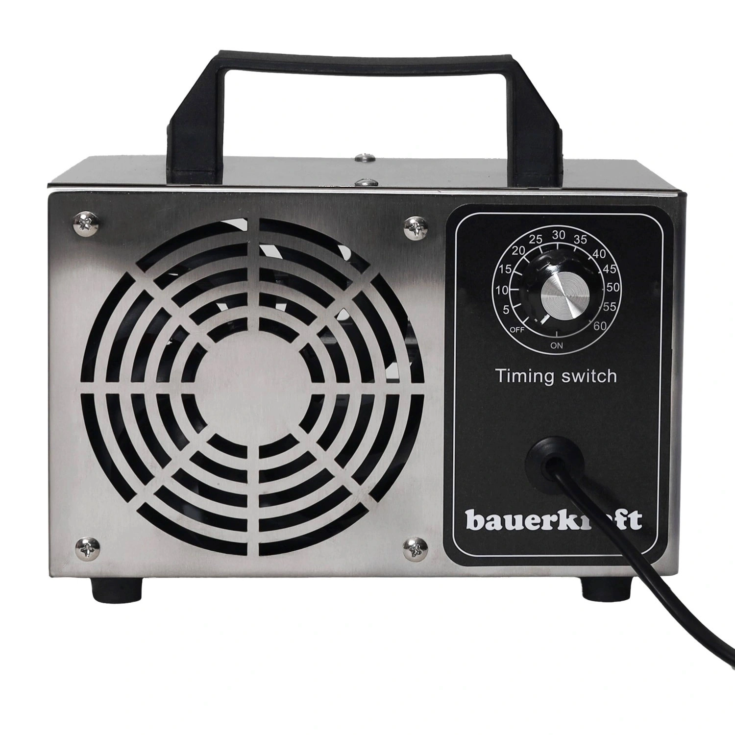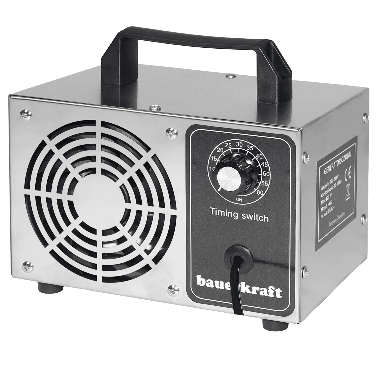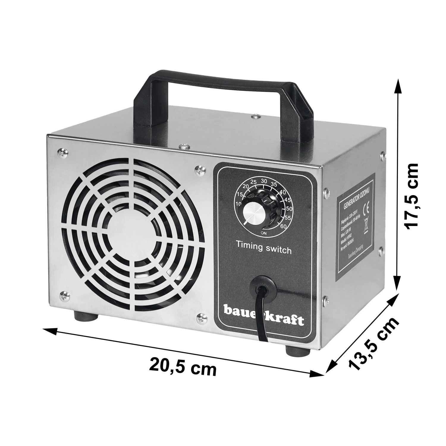 Vadība ir maksimāli vienkārša – integrētais taimeris ļauj iestatīt darbības laiku līdz 60 minūtēm, ņemot vērā telpas izmēru un piesārņojuma līmeni. Kompaktie izmēri un ērtā roktura konstrukcija atvieglo pārvietošanu un uzglabāšanu, tāpēc tas ir piemērots mājām, birojiem, viesnīcām, medicīnas iestādēm un automašīnu salonu ozonēšanai.