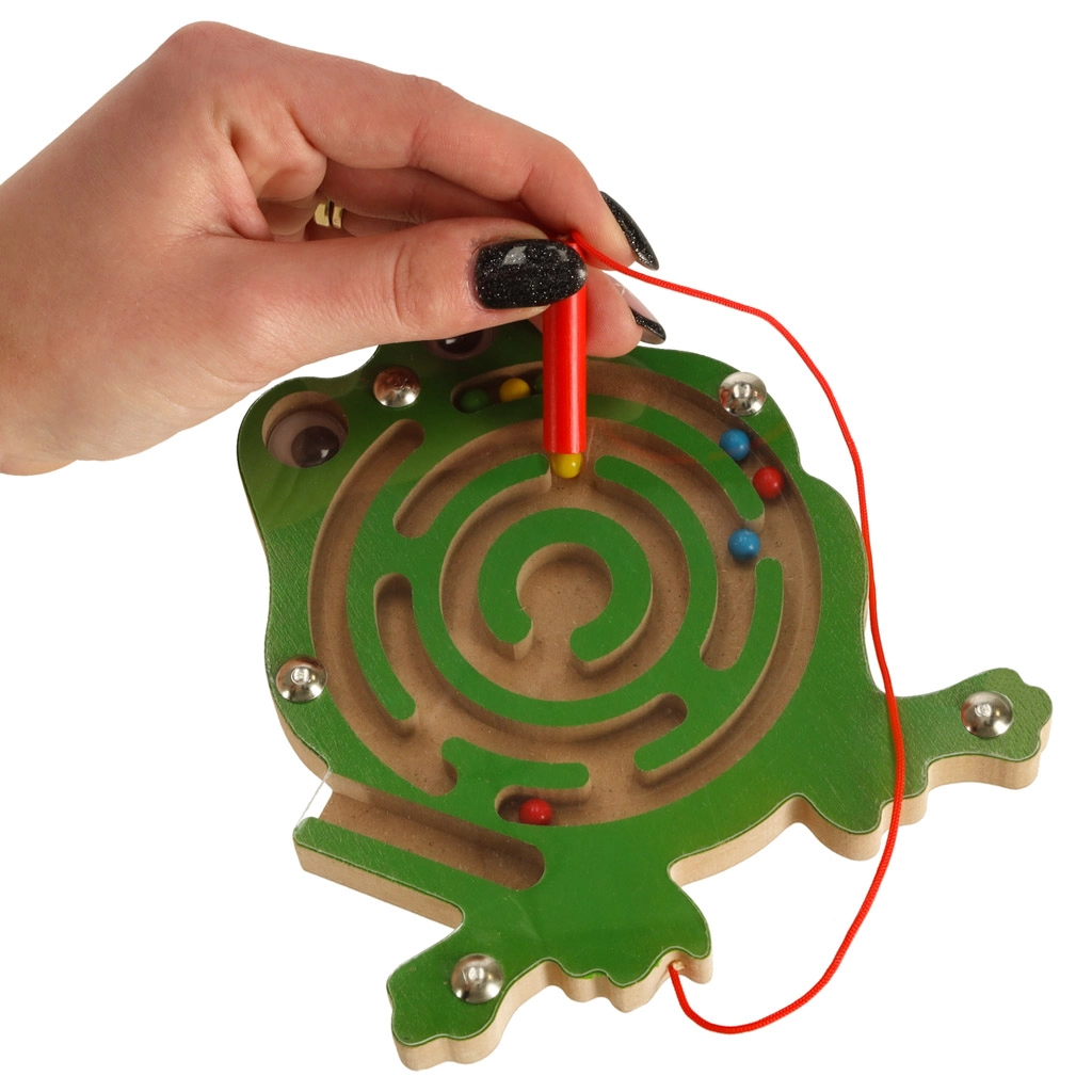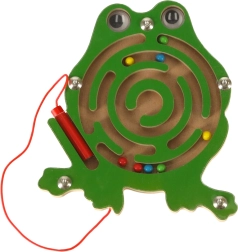 Šis koka magnētiskais labirints vardītes formā izklaidēs bērnus ilgi gan mājās, gan ceļā. Komplektā esošā magnētiskā pildspalva ar aukliņu palīdz vadīt krāsainās lodītes pa līkumotajiem celiņiem līdz mērķim. Caurspīdīgs vāks nodrošina, ka lodītes vienmēr paliek rotaļlietas iekšpusē.
