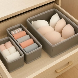 Uzturiet savu apakšveļu un aksesuārus vienmēr savā vietā ar šo praktisko organizatoru komplektu. Tas ietver 6 dažādu izmēru vienības, kas nodrošina universālu pielietojumu un vienkāršu kopšanu. Stilīgais, gaiši pelēkais dizains piešķir eleganci un viegli iederas jebkurā skapī. Katrs organizators ir izstrādāts tā, lai būtu stabils un ilgmūžīgs.
