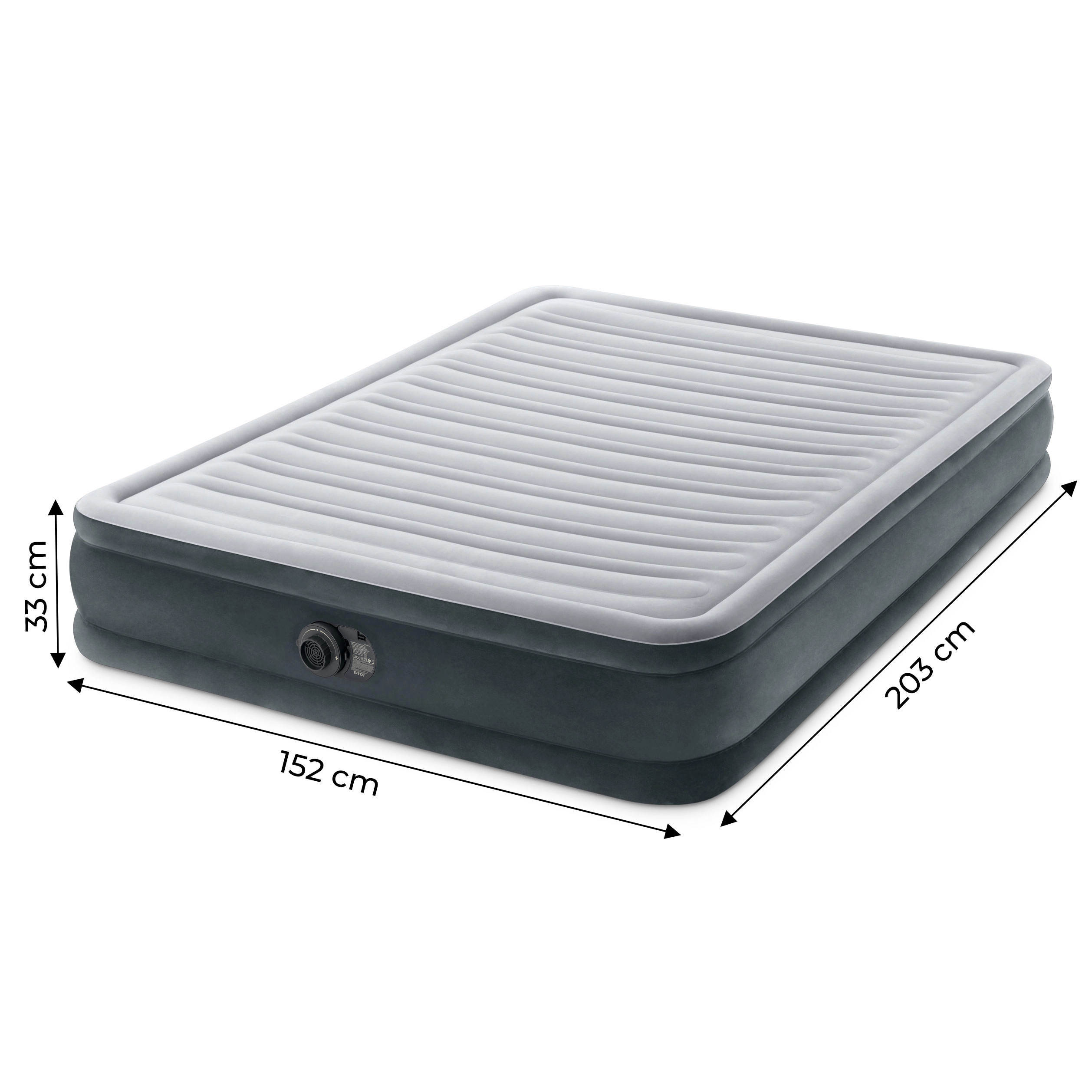 Praktiska divvietīga uzpūšamā gulta ar izmēriem 203 × 152 × 33 cm piedāvā ātru uzpūšanu ar iebūvētu elektrisko pumpi, komfortablu samta (velūra) virsmu un izturīgu iekšējo Fiber‑Tech konstrukciju. Pateicoties Dura‑Beam sistēmai, tā nodrošina pareizu mugurkaula atbalstu, augstu stabilitāti un kravnesību līdz 272 kg. Komplektā ir transportēšanas soma ērtai pārnēsāšanai un glabāšanai.