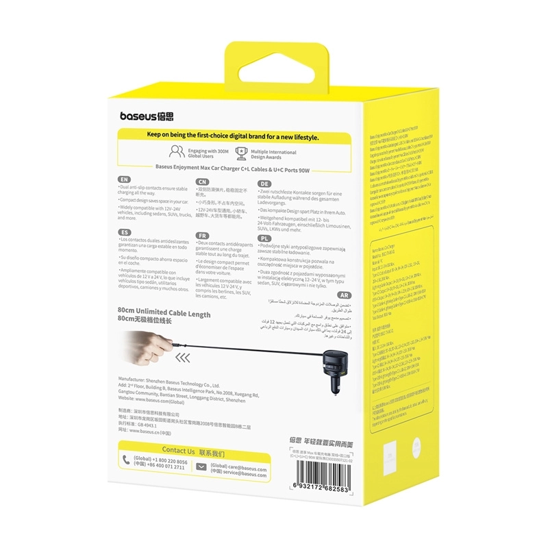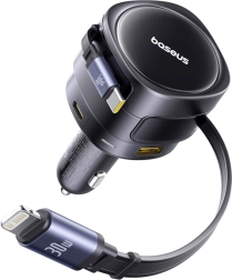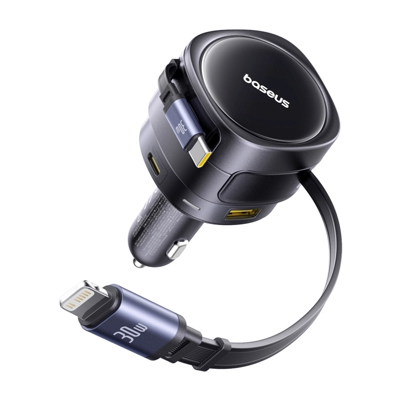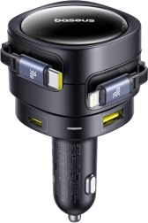 Baseus automašīnas lādētājs piedāvā iespēju lādēt četras ierīces vienlaikus, izmantojot divus iebūvētos kabeļus (USB‑C un Lightning) kopā ar vēl diviem portiem (USB‑C un USB‑A).