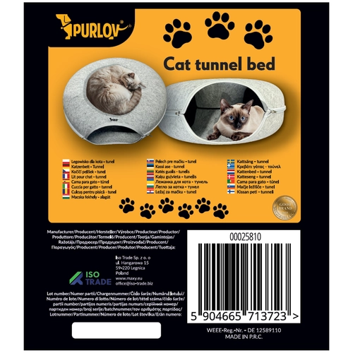 PURLOV kaķu tunelis ir ideāla izvēle ikvienam kaķa saimniekam, kurš savam mīlulim vēlas nodrošināt ērtu un mājīgu vietu. Ergonomisks dizains un mīksts filca materiāls gādā, lai jūsu kaķis justos kā savā karalistē.