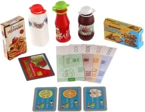 • Banknošu, monētu un pārtikas maketi – viss pilnvērtīgam veikala aprīkojumam.