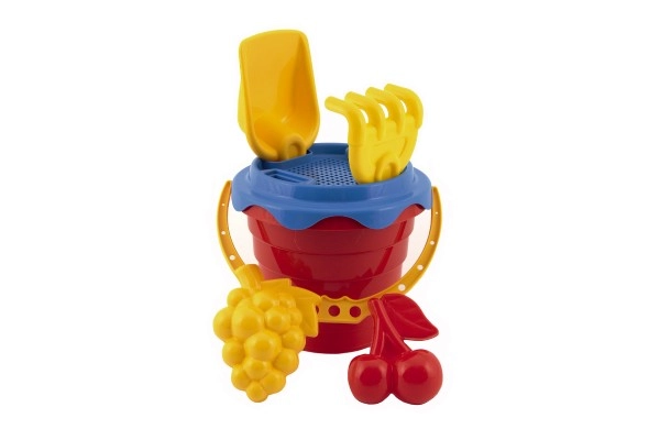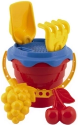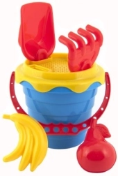 Komplektā atradīsiet visu nepieciešamo spēlēm smiltīs, tostarp spainīti, sietiņu, lāpstiņu, grābeklīti un divas formiņas.