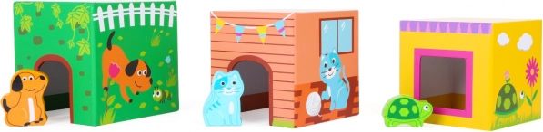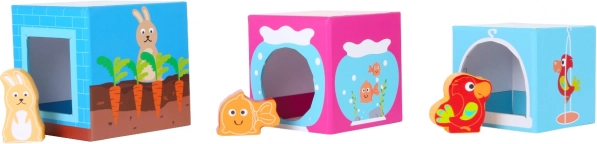 Seši mīlīgi koka dzīvnieciņi iederas atbilstošajās atverēs klucīšos. Bērni vingrina šķirošanu, pārošanu un radošu spēli.