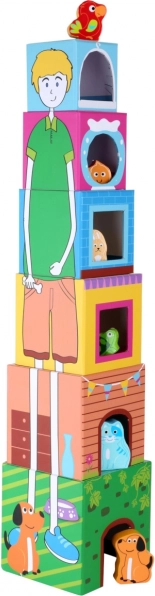 Šis burvīgais kraušanas tornis no izturīgiem kartona klucīšiem un koka dzīvnieciņiem māca bērniem kārtot pēc izmēra, novērtēt telpu un trenēt veiklību. Klucīši tiek salikti no lielākā uz mazāko stabilā tornī līdz apmēram 58 cm, un, pateicoties atverēm klucīšos, bērni tajos ievieto atbilstošos dzīvnieciņus.