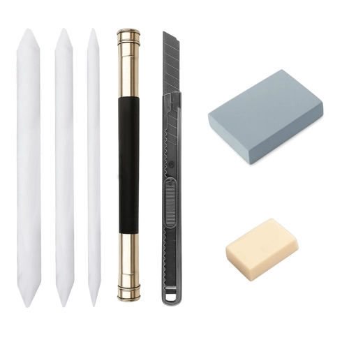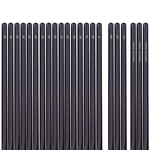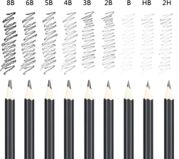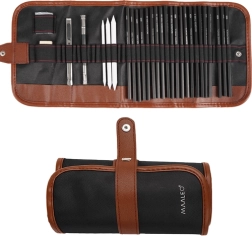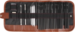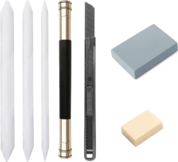 Specifikācijā atradīsiet: 18 zīmēšanas zīmuļus ar dažādu cietību, 3 ogļu zīmuļus, zīmuļu pagarinātāju, 3 papīra maisāmkociņus (blendīrus), dzēšgumiju, papīra griezni un stilīgu melnu etviju.