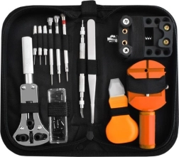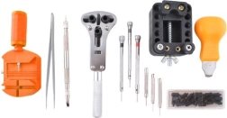 - regulējams atslēdzis, 18 uzgaļu komplekts, regulējams pulksteņu turētājs, 3x tapu izvilcējs, precīzā pincete, 3x skrūvgriezis ar maināmiem uzgaļiem, aproču saīsināšanas instruments, vāciņu nazis, maciņš