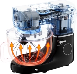 Iepakojumā atradīsiet bagātīgu piederumu komplektu: mīklas āķi, putotāju, plakano maisītāju, bļodas vāku, lāpstiņu, dzeltenumu atdalītāju un pilnu konditorejas komplektu ar 24 trezīrošanas uzgaļiem organizatorā. Iekļauts arī QR kods ar receptēm, kas soli pa solim palīdzēs gatavošanā. Pretizslīdes kājiņas nodrošina stabilitāti, un atlasītas detaļas var mazgāt trauku mazgājamajā mašīnā.