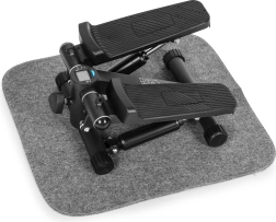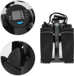 Integrētais LCD displejs (5 funkcijas) skaidri rāda laiku, soļus/min, kopējo soļu skaitu, sadzedzinātās kalorijas un režīmu SCAN. Pretslīdes pedāļi un stabilizējošās kājiņas nodrošina drošību un komfortu. Aizsargpaklājiņš no vilnas filca slāpē vibrācijas, aizsargā grīdu un novērš ierīces pārvietošanos arī mazākās telpās.