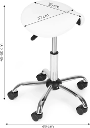 Profesionāls pagriežams seglu tipa krēsls saloniem un medicīnas iestādēm piedāvā ergonomiskas formas sēdekli, vienmērīgu augstuma regulēšanu, 360° pagriežamu sēdisko daļu un stabilu piecu zaru pamatni ar ritenīšiem. Izturīgs PVC ādas apšuvums, ērta 4 cm putu pildviela un augsta 150 kg celtspēja nodrošina komfortu, mobilitāti un ilgmūžību.