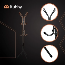 Elegantais brīvi stāvošais pakaramais RUHHY piedāvā praktisku un stabilu risinājumu priekšnamiem, guļamistabām, birojiem un uzgaidāmajām telpām. Pateicoties trim pakarināšanas līmeņiem, izturīgai metāla konstrukcijai uz 4 kājām un noapaļotām āķu uzgaļiem, tas droši un pārskatāmi notur mēteļus, jakas, šalles un somas. Brīvi stāvošs izpildījums ļauj viegli pārvietot bez urbšanas un instrumentiem.