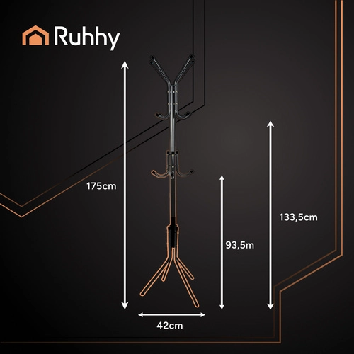 Pakaramais RUHHY apvieno tīru dizainu un augstu funkcionalitāti. Universālā melnā krāsa iederas gan modernos, gan klasiskos interjeros, un kompaktie izmēri nodrošina lielisku izmantojumu arī mazākās telpās. Pateicoties stabilajai konstrukcijai un trim āķu augstumiem, ērti novietosiet ikdienas un sezonālās drēbes.