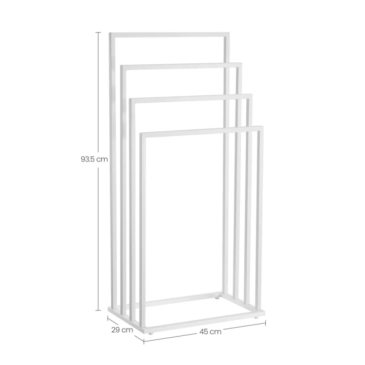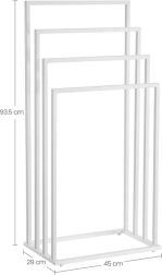 Elegantais brīvi stāvošais dvieļu statīvs ar četrām rokām matēti baltā krāsā palīdzēs uzturēt jūsu vannasistabu un veļas telpu kārtībā. Pateicoties izturīgajai tērauda konstrukcijai un pakāpeniski izvietotajām rokām, tas nodrošina ātru vēdināšanu un ērtu dvieļu žāvēšanu, kā arī peldkostīmu un smalkās veļas žāvēšanu. Stabils, izturīgs un estētisks aksesuārs modernam interjeram.