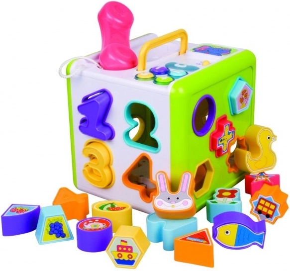Šis ievietošanas komplekts ir ideāli piemērots pašiem mazākajiem, pateicoties košajām krāsām un dažādajām formām ievietošanai. Katrā kuba pusē ir atveres, kas paredzētas formu, burtu un ciparu ievietošanai, kas motivē bērnus mācīties un rotaļīgā veidā iepazīt apkārtējo pasauli.