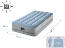 Praktiska un ērta uzpūšamā gulta vienai pieaugušai personai ar izmēriem 191 × 99 × 36 cm. Pateicoties Fiber-Tech un Dura-Beam tehnoloģijām, tā nodrošina stabilu atbalstu, mīkstu velūra virsmu un ilgstošu kalpošanas laiku. Iebūvēta USB elektriskā pumpa parūpēsies par ātru uzpūšanu jebkur – no barošanas bloka, lādētāja vai USB porta. Maksimālā slodze 136 kg, komplektā ir pārvadāšanas soma un remonta ielāps.