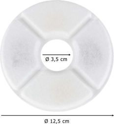 Filtru diametrs ir 12,5 cm ar centrālo atveri 3,5 cm, tāpēc tie viegli der lielākajai daļai apaļu strūklaku ar centrālo stabu. Uzstādīšana ir ātra un bez instrumentiem – vienkārši ievietojiet, izskalojiet un lietojiet.