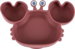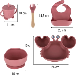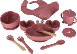 Šis 9 daļu komplekts elegantā tumši rozā tonī ietver visu, kas nepieciešams ērtai un drošai bērna ēdināšanai no 6 mēnešu vecuma. Krabja šķīvis ar nodalījumiem un bļoda ar efektīviem piesūcekņiem stabili turas uz galda vai barošanas krēsliņa, tā samazinot krišanas risku un nekārtību. Mīksts pārtikas kvalitātes silikons bez BPA ir saudzīgs smaganām un zobiņiem un ir viegli tīrāms.