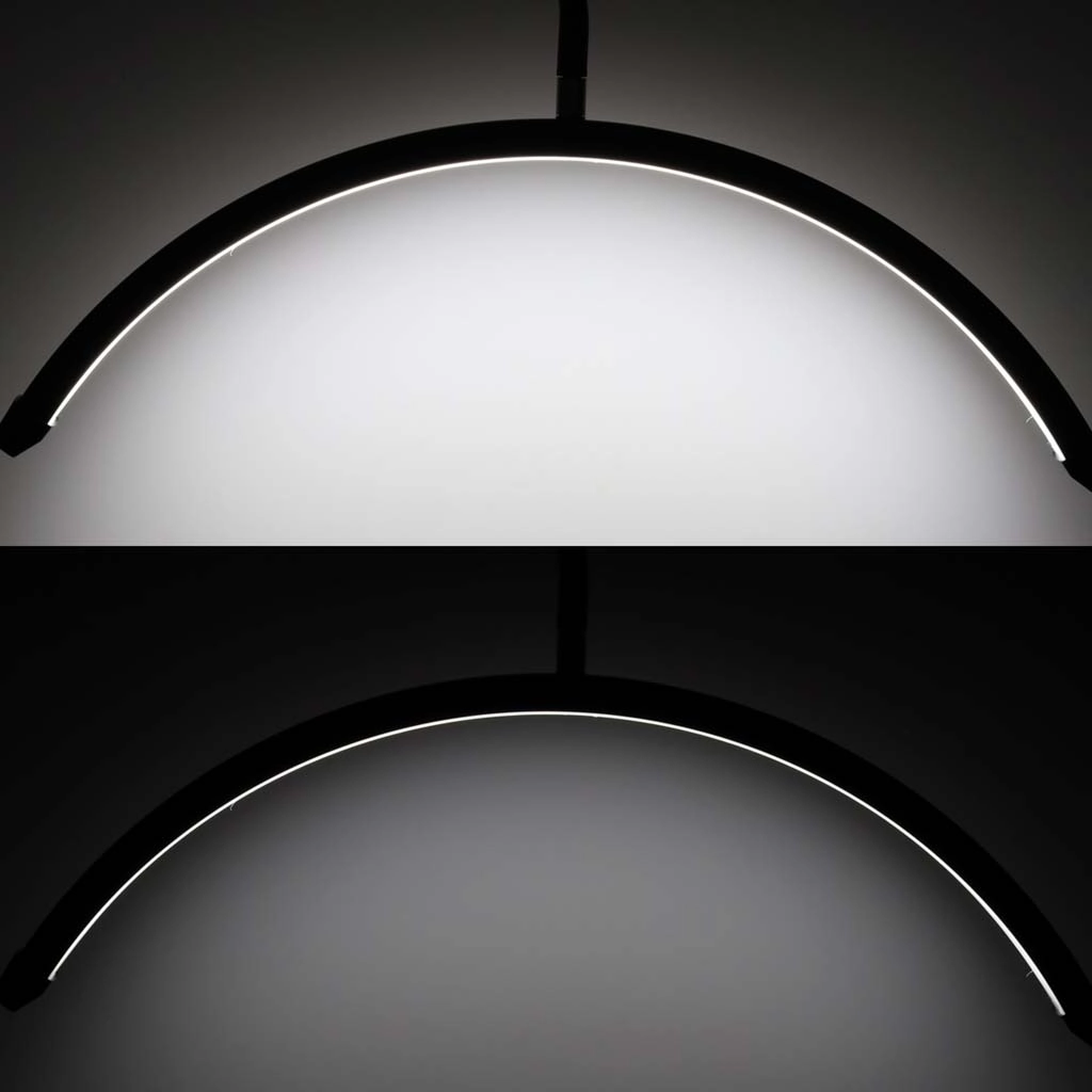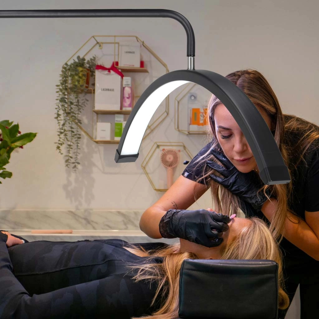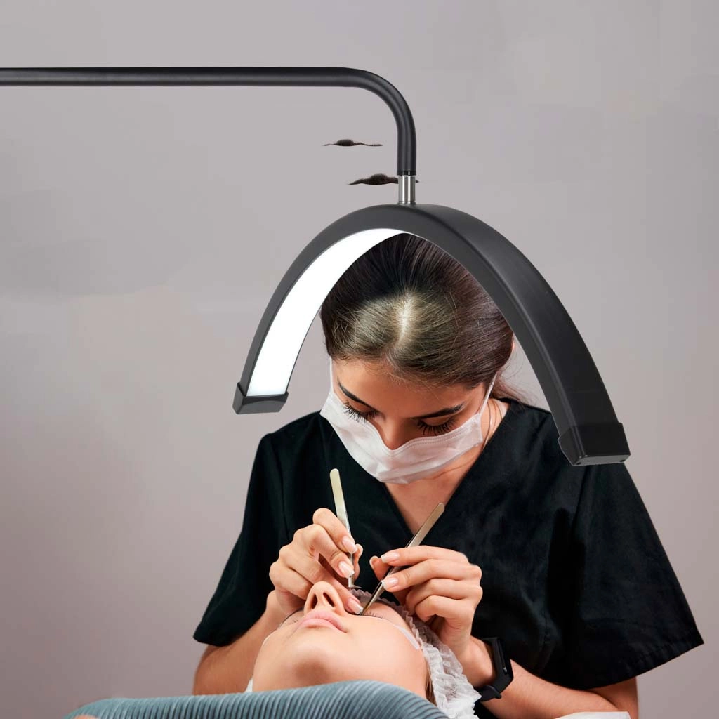 Lokveida LED galva (64 cm) vienmērīgi izgaismo darba virsmu bez asām ēnām – ideāli precīzam darbam ar skropstām, uzacīm un nagiem.