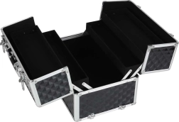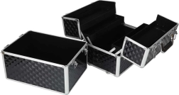 Šis lielais kosmētikas koferis frizieru “train case” stilā nodrošina pārdomātu telpas sadalījumu: atverot vāku, izslīd četras pārskatāmas paplātes, bet apakšējā daļā ir dziļa kamera lielākiem produktiem, pudelītēm un piederumiem. Izturīgais izpildījums ar alumīnija malām un pastiprinātiem stūriem sargā saturu gan ceļojumos, gan ikdienas lietošanā.