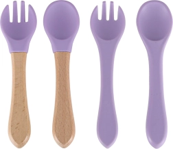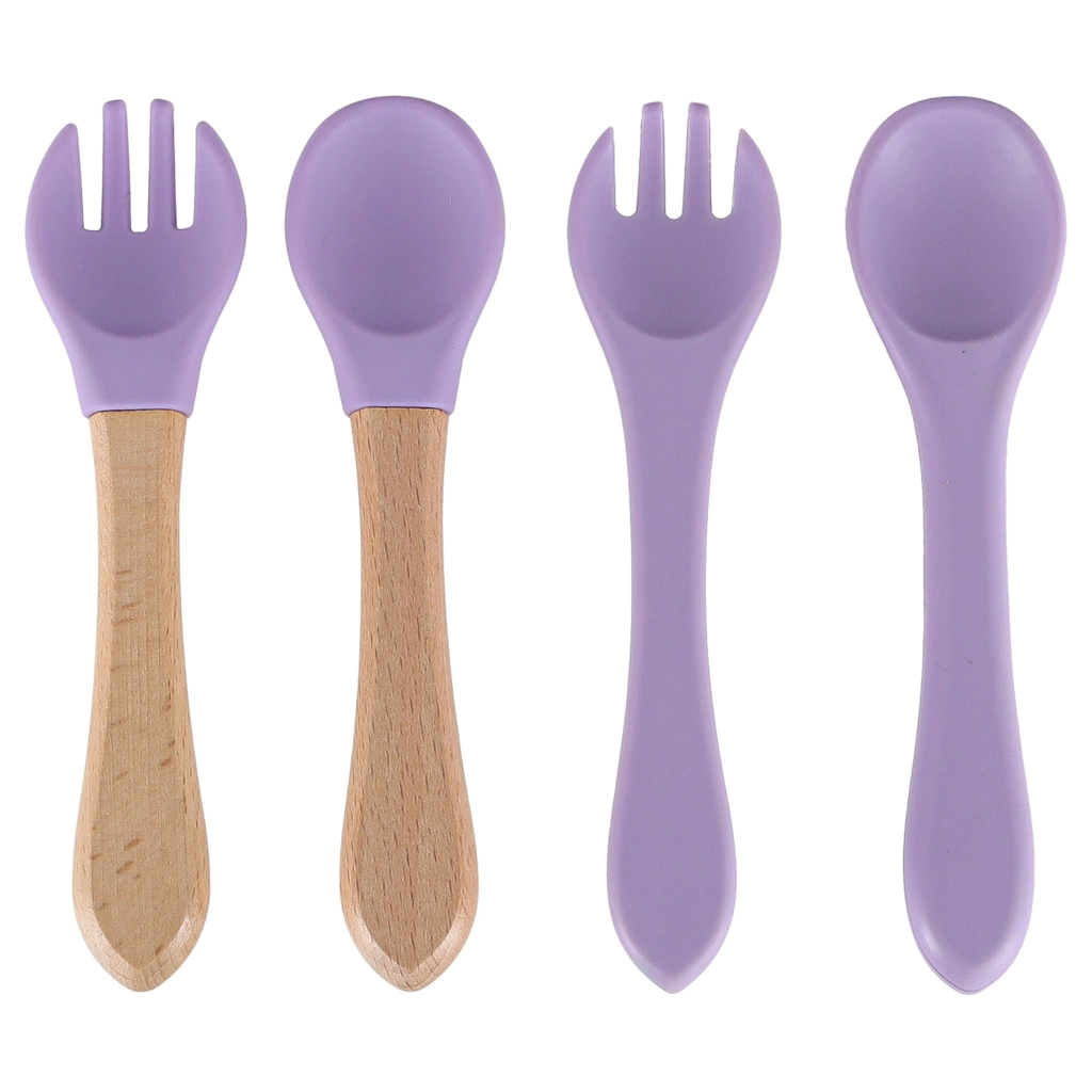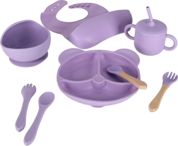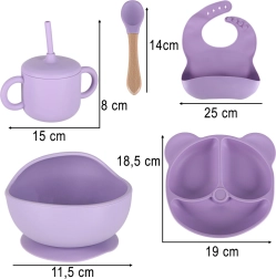 Pilns silikona ēdināšanas komplekts bērniem elegantā violetā krāsā atvieglo pirmos soļus patstāvīgā ēšanā. Komplektā ir viss nepieciešamais: sadalīts šķīvis ar piesūcekni, bļoda ar piesūcekni, mācību krūzīte ar vāciņu un salmiņu, 2 karotītes un 2 dakšiņas un regulējams priekšautiņš ar kabatu. Izgatavots no droša, bez BPA silikona, piemērots trauku mazgājamai mašīnai un mikroviļņu krāsnij.
