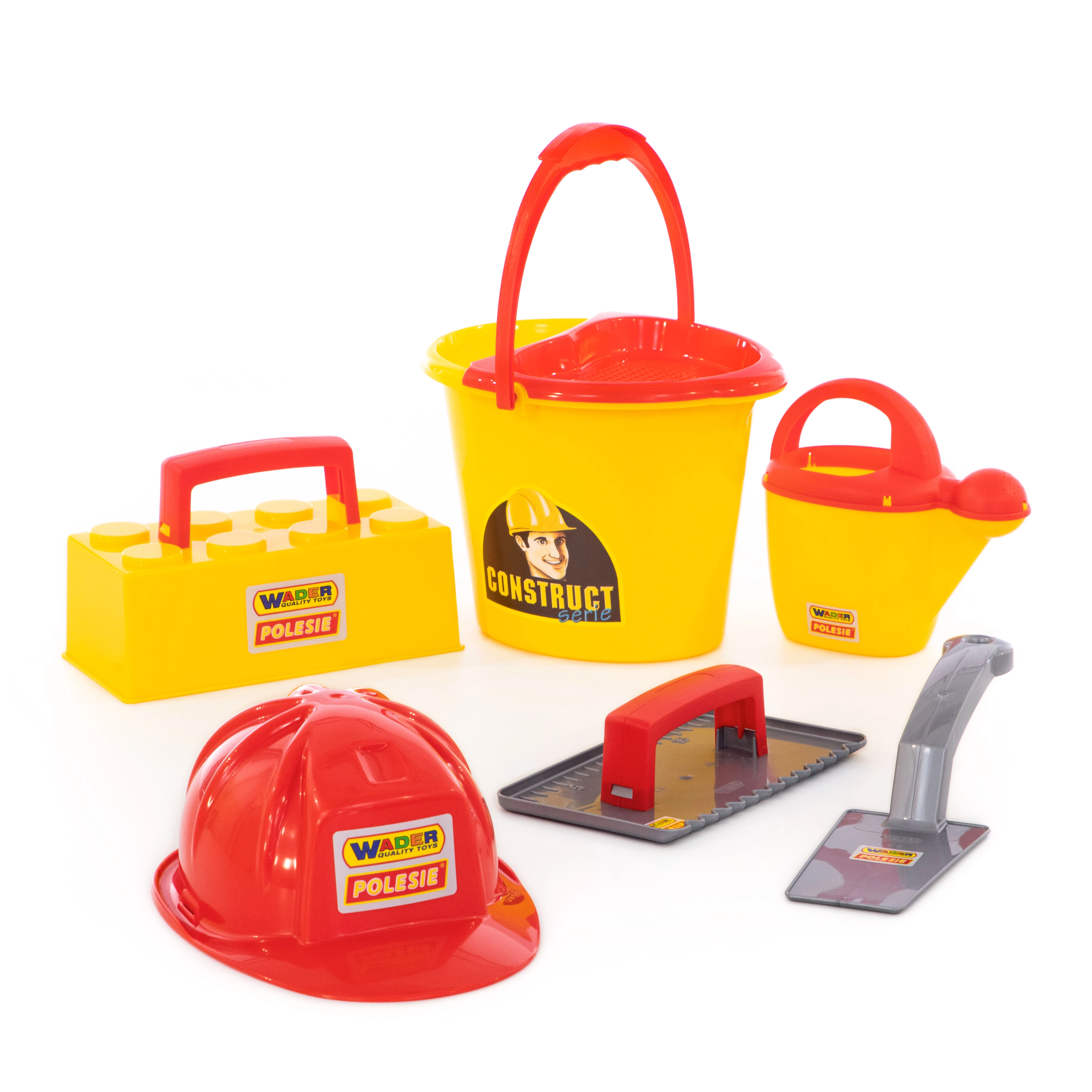 Šis Wader ConsTruct mūrēšanas būvkomplekts pārvērš jebkuru smilšu kasti mazā būvlaukumā. Bērni var smelt, pārvadāt, veidot un “mūrēt” savus darinājumus ar ķieģeļu formas palīdzību, bet ķivere palīdz autentiskai lomu spēlei. Viegls un izturīgs plastmasas materiāls ar gludām malām ir ideāli piemērots drošai spēlei ārā un pie ūdens.