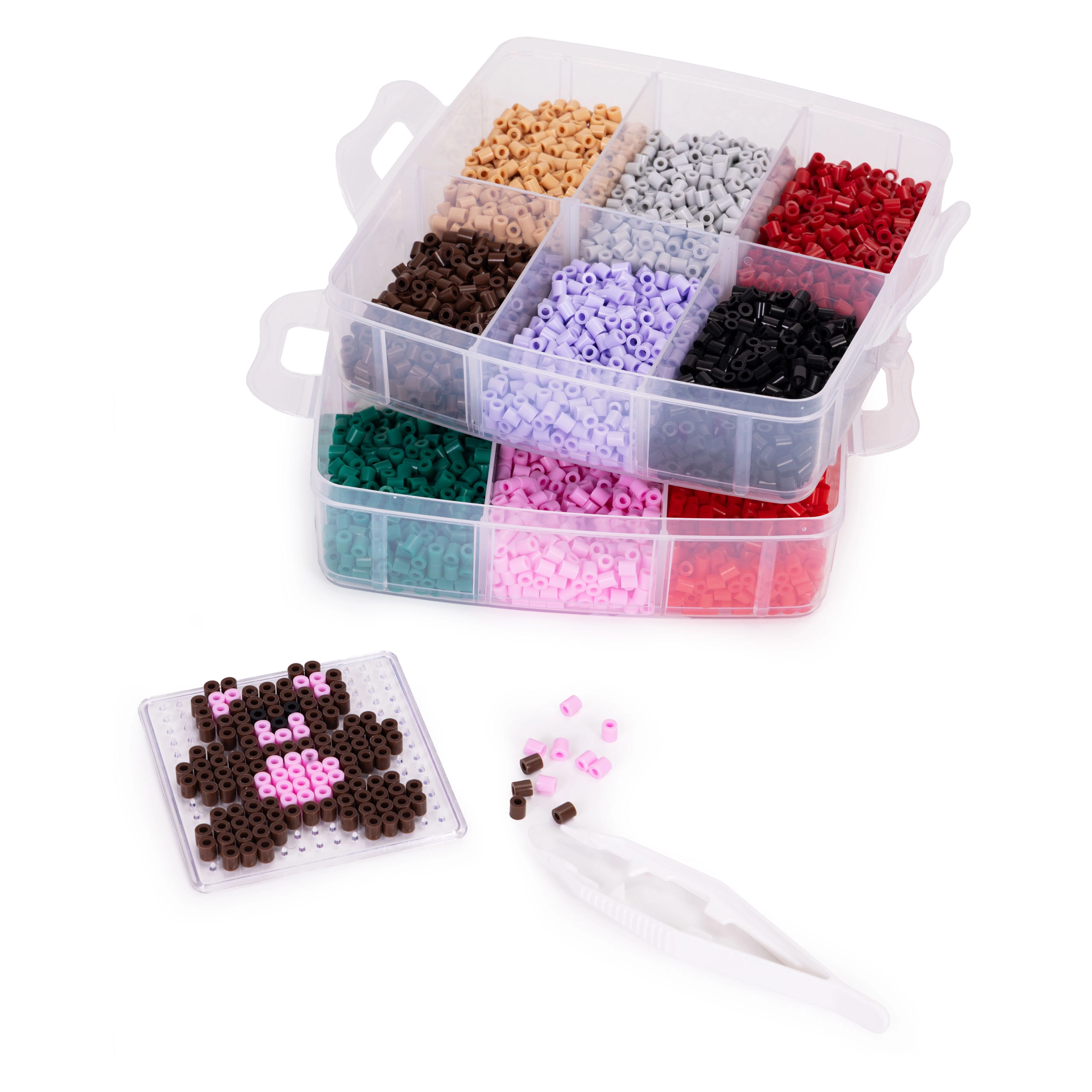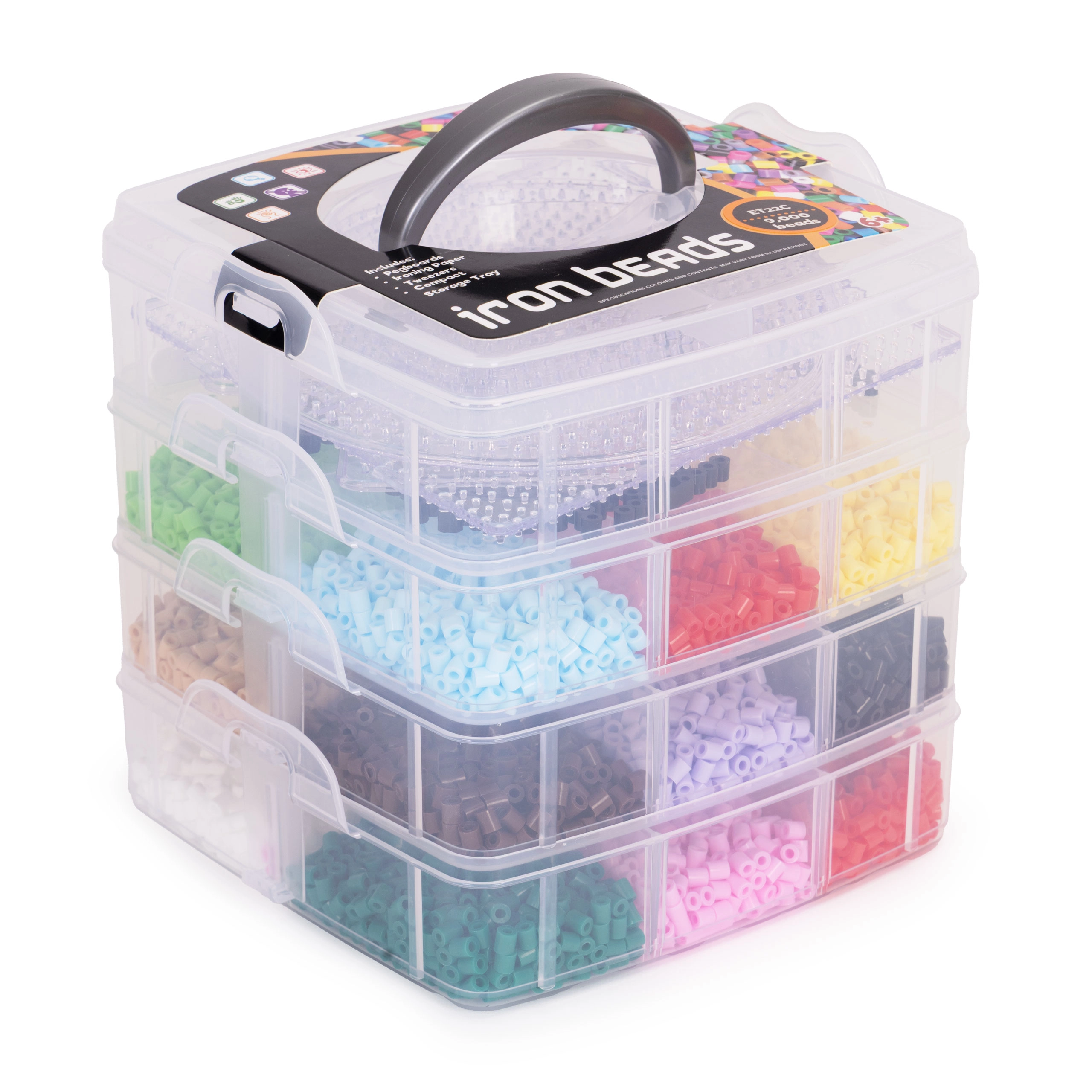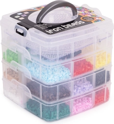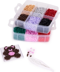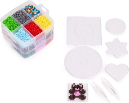 Komplektā ietilpst: līdz 9000 pērlīšu daudzās krāsās, 6 pamatnes (aplīs, kvadrāts, zvaigzne, sirds u.c.), 2 pincetes, gludināšanas papīri, dizaina šabloni un ietilpīgs organizators ar nodalījumiem. Pateicoties sakraujamai kastei, viss ir pārskatāmi sakārtots un gatavs nākamajiem radošajiem darbiem mājās vai ceļā.