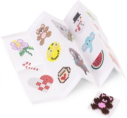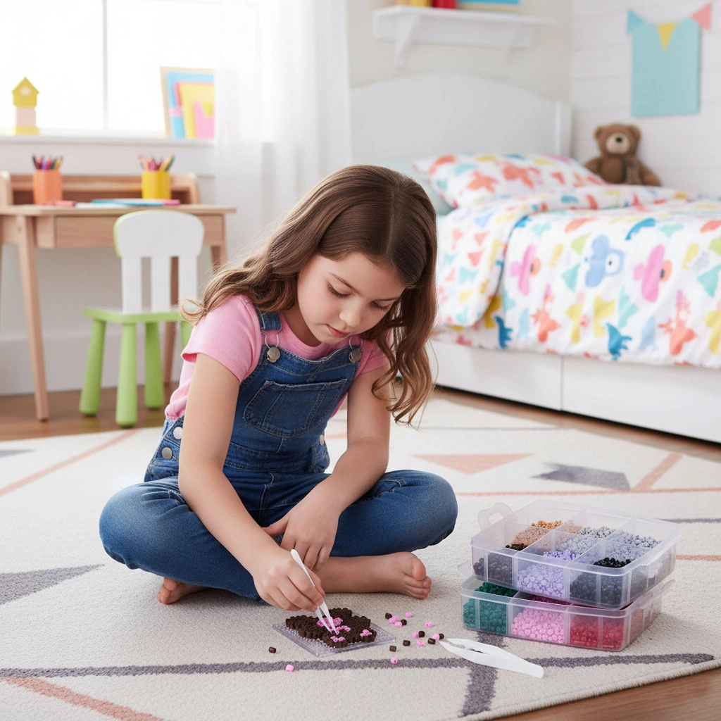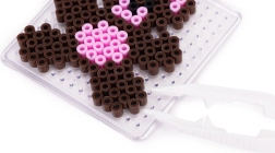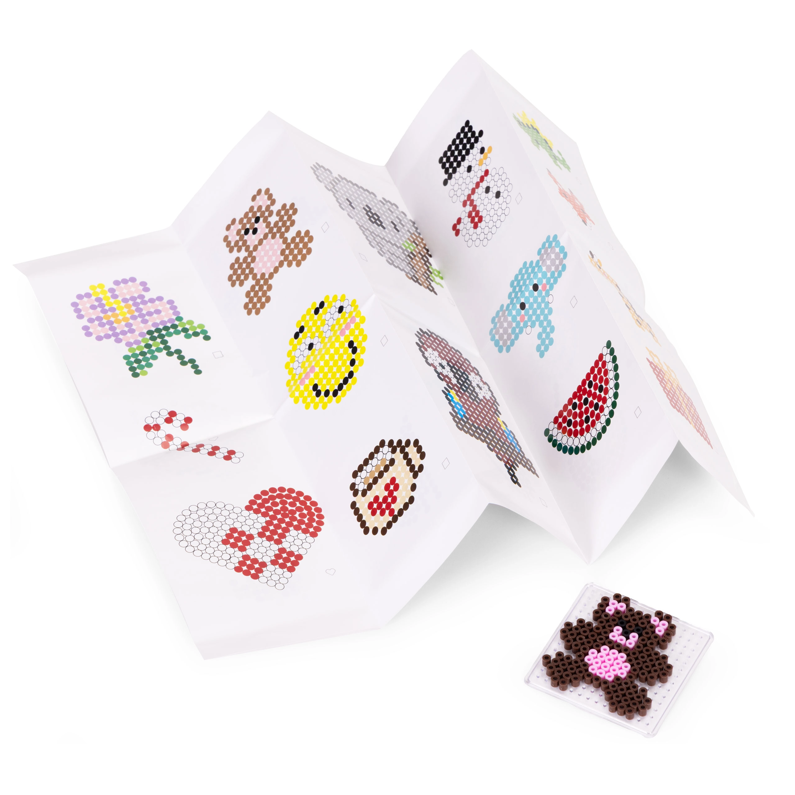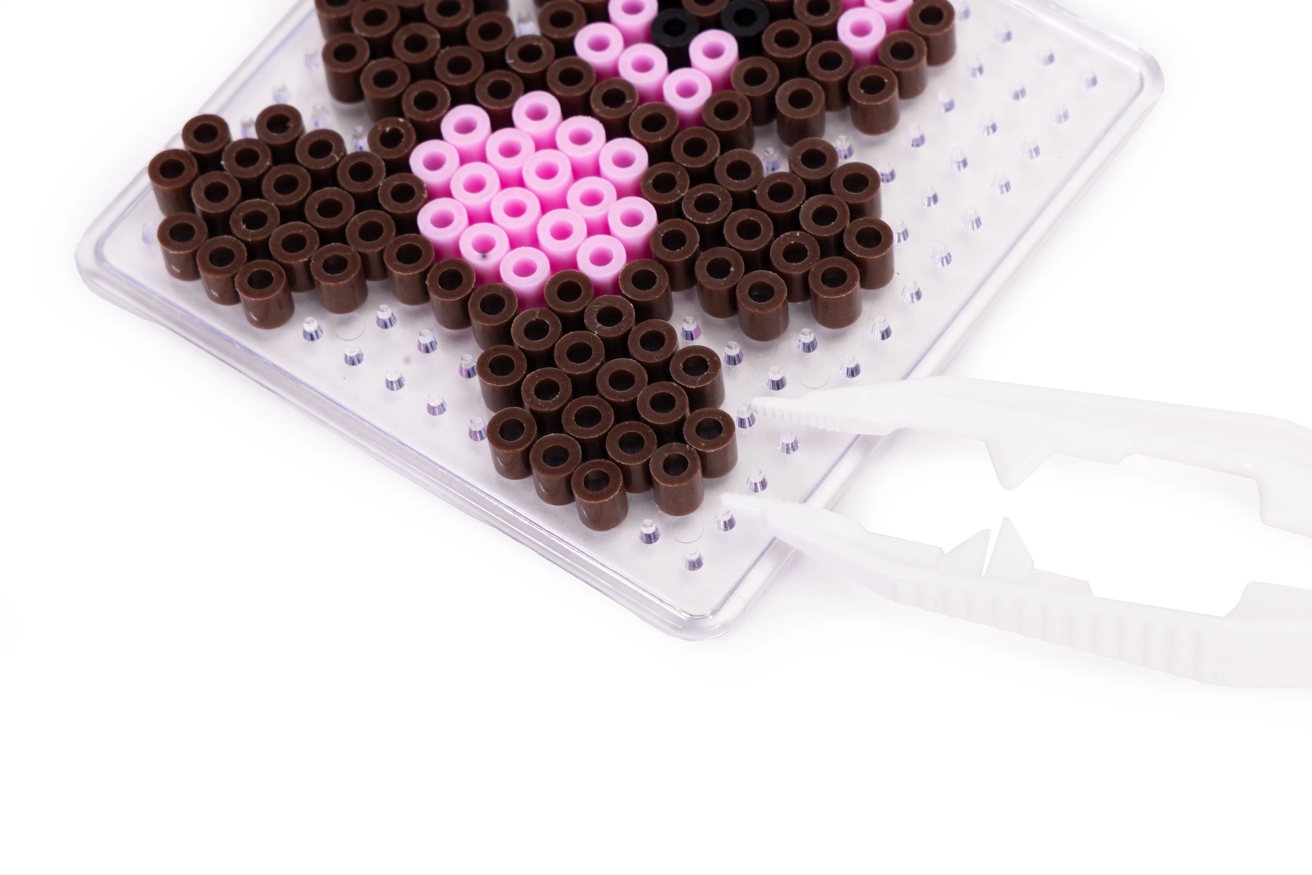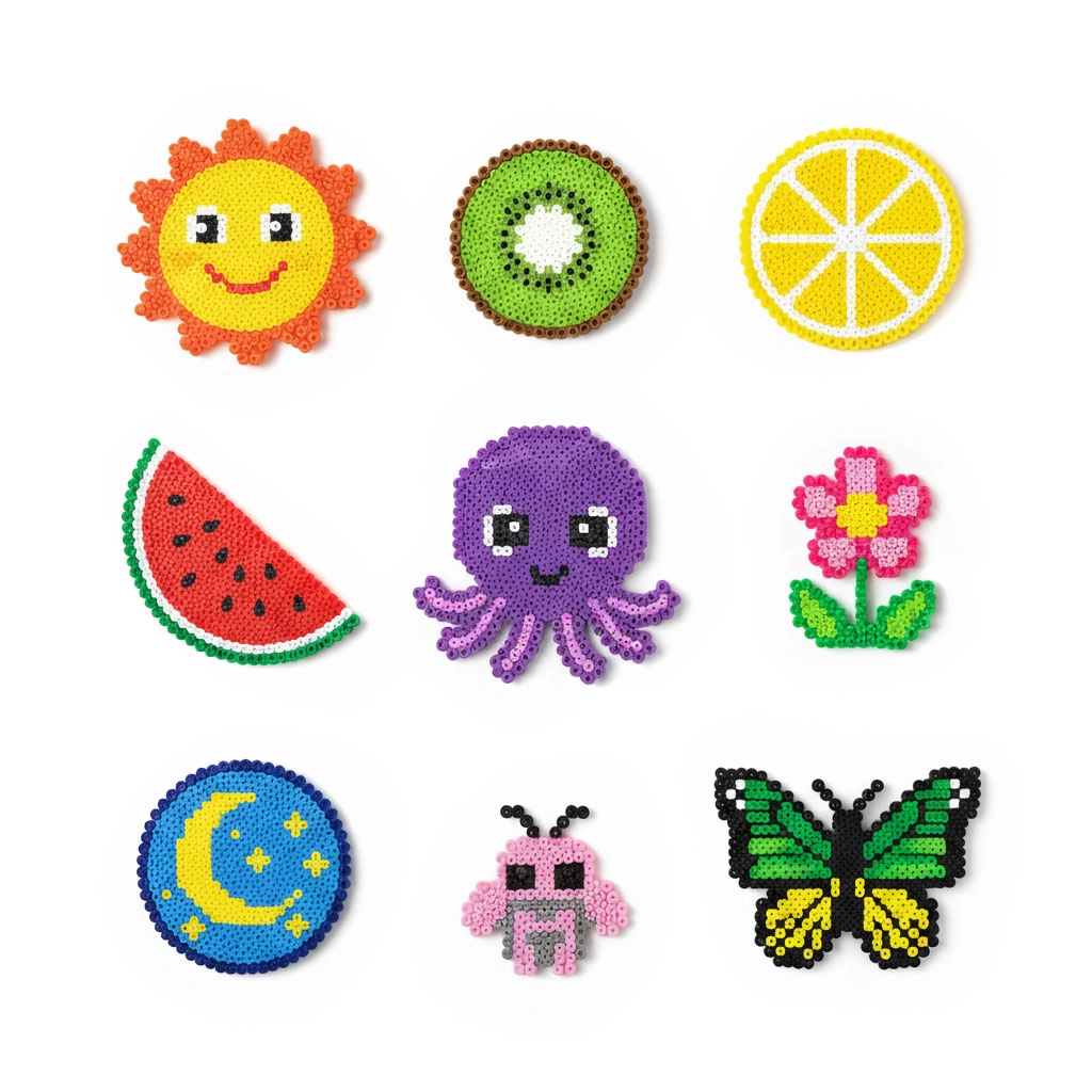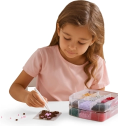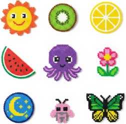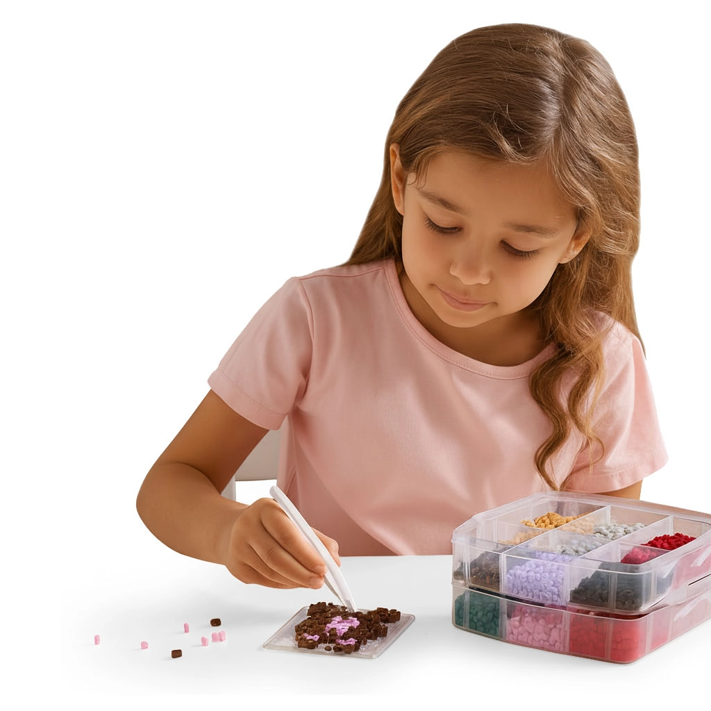 Liels pērlīšu krājums plašā krāsu paletē ļauj bērniem veidot dzīvnieciņus, simbolus, rotājumus un “pikseļu mākslas” attēlus – no vienkāršiem motīviem līdz sarežģītiem rakstiem.