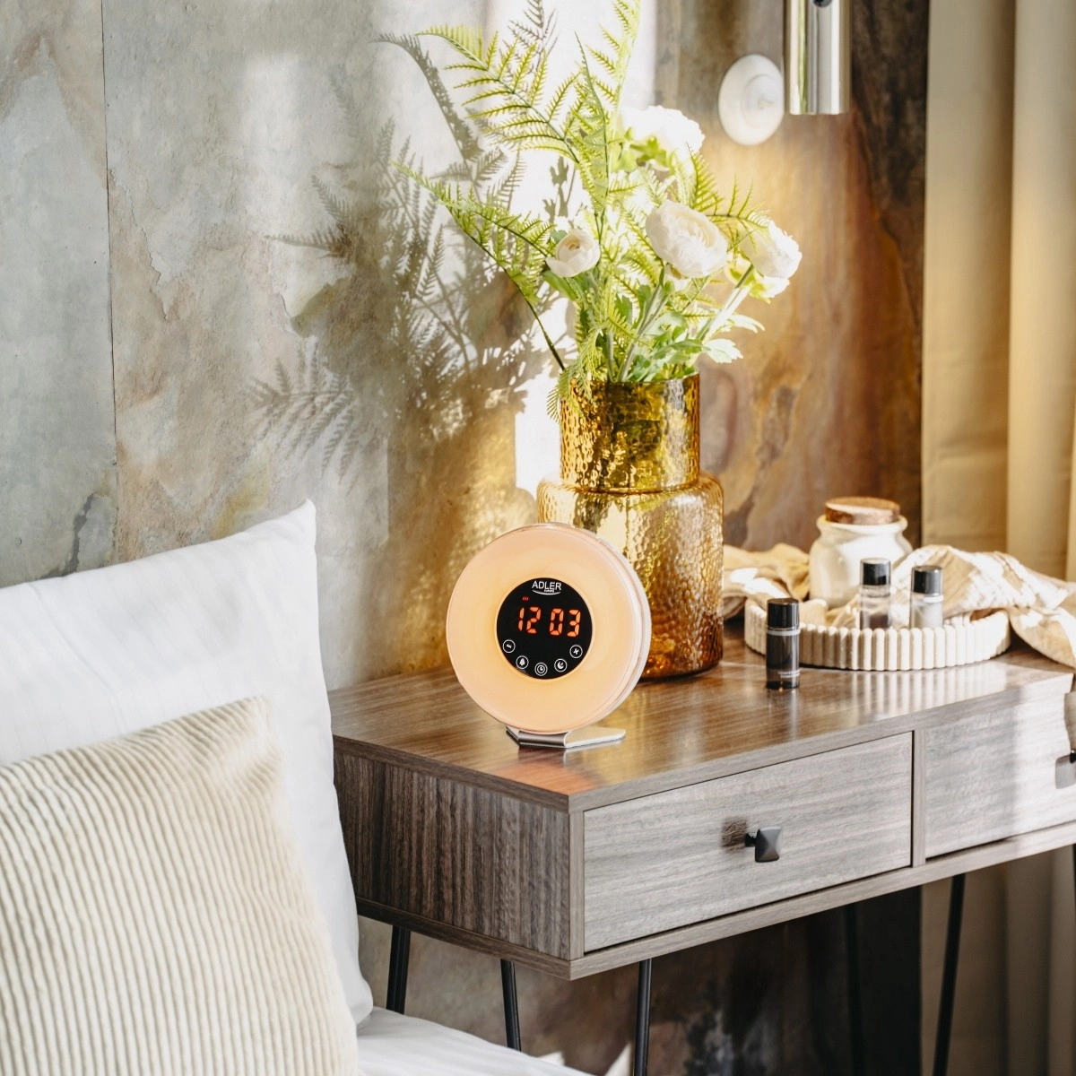 Mostieties maigi un mundri ar dabisku rītausmas simulāciju, kas pakāpeniski palielina gaismas intensitāti un atbalsta veselīgu cirkadiāno ritmu. Izvēlieties modināšanu ar jūras, lietus, putnu skaņām, mierīgu mūziku vai ar iecienīto FM staciju (87,5–108 MHz).
