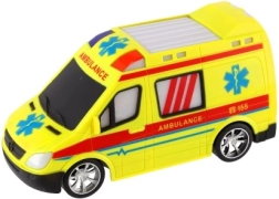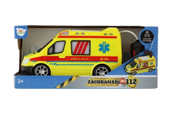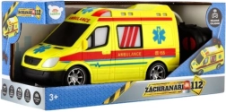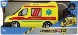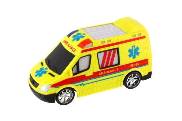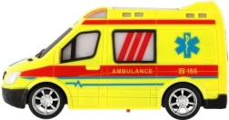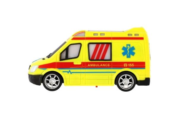 Koši dzeltena ātrā palīdzība ar AMBULANCE uzrakstiem un funkcionējošu gaismu veicina radošu spēli mazajiem glābējiem.