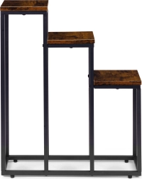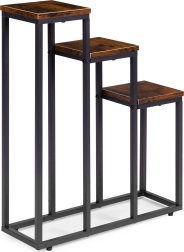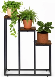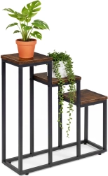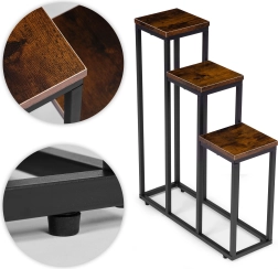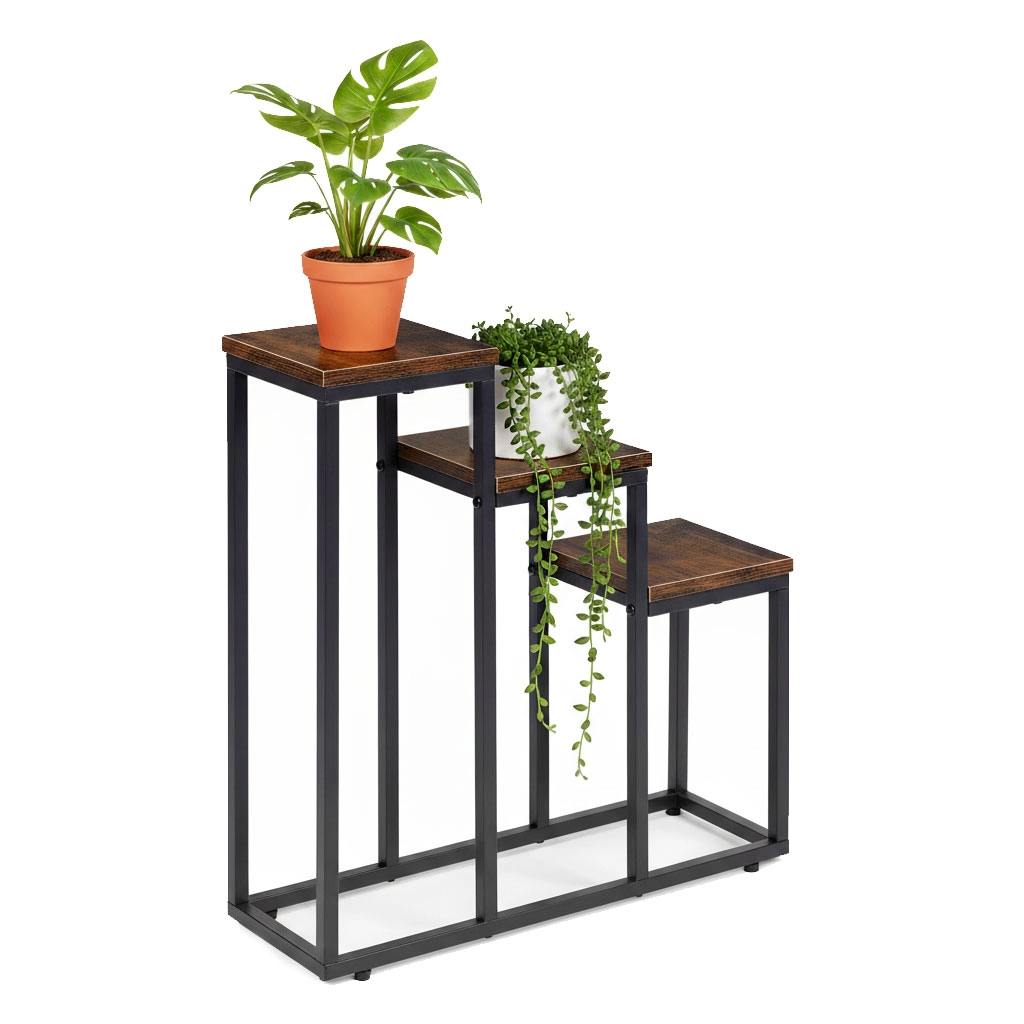 Trīsstāvu puķu statīvs industriālā lofta stilā apvieno minimālistisku dizainu un praktisku vertikālu izkārtojumu. Pateicoties kompaktajiem izmēriem, tas lieliski iederas mazākos interjeros un palīdz izmantot telpas augstumu – ideāli garšaugiem virtuvē, papardēm priekšnamos un dekoratīvajiem augiem viesistabā.