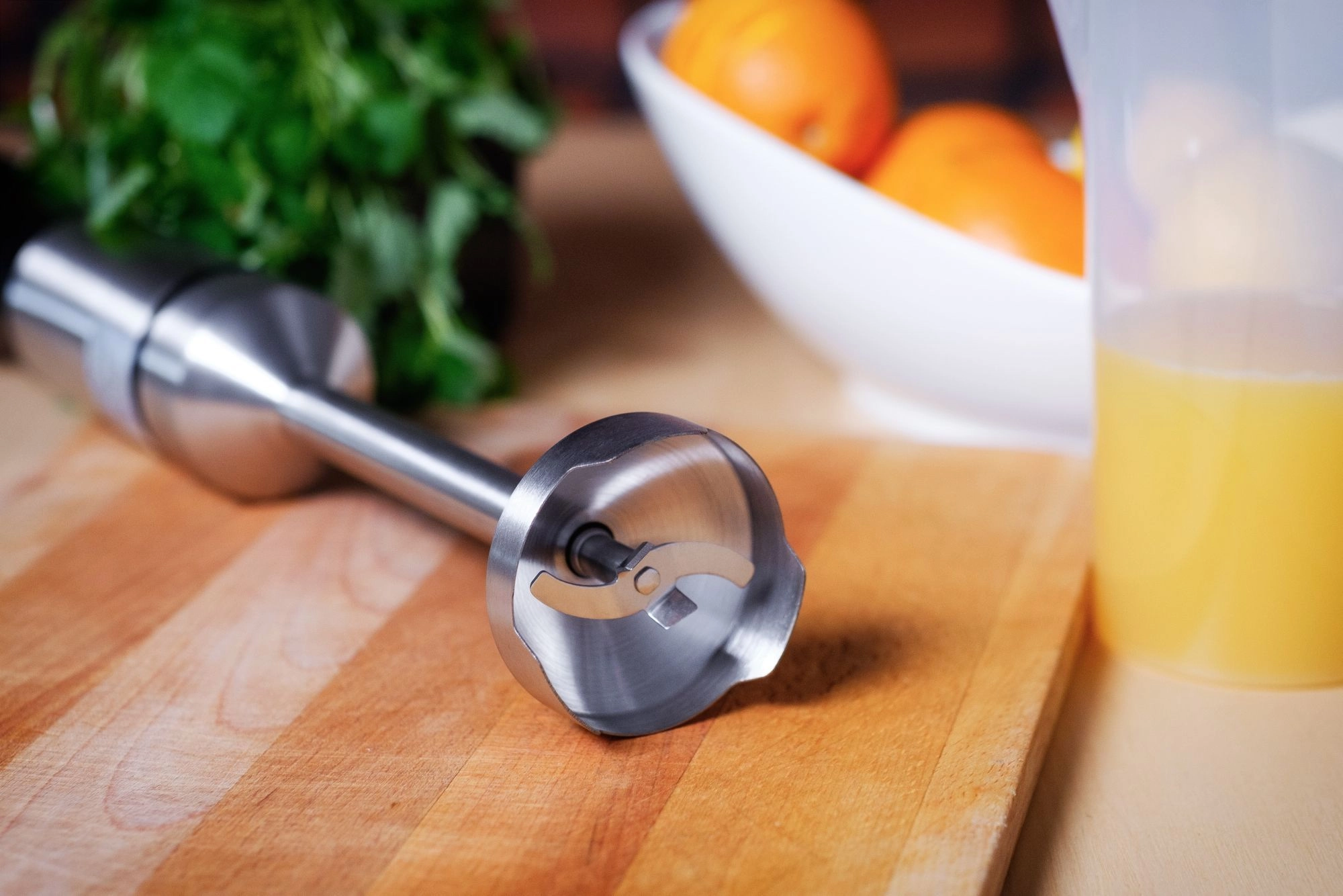 Divlīmeņu nerūsējošā tērauda asmeņi tiek galā ar augļiem, dārzeņiem un riekstiem. Noņemamā kāja ar aizsardzību pret šļakstīšanos atvieglo tīrīšanu, ergonomiskais rokturis nodrošina drošu satvērienu arī ilgākā darbā. Metlis ir ideāls putukrējumam un olbaltumiem, bet 700 ml blendera trauks – gludiem smūtijiem un mērcēm.