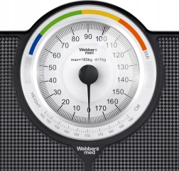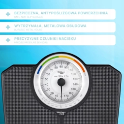 Klasiski mehāniskie personālie svari WEBBER ar maksimālo slodzi līdz 180 kg piedāvā uzticamu mērīšanu bez baterijām. Liels, viegli salasāms ciparnīca ar iedaļām pa 1 kg nodrošina ātru un precīzu nolasīšanu, krāsainās zonas un BMI funkcija palīdz orientējošai svara kontrolei. Izturīgs izpildījums, pretbuksēšanas virsma un elegants melns dizains lieliski iederas jebkurā vannas istabā.