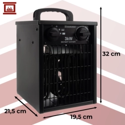 Jaudīgā elektriskā karstā gaisa krāsns KAMINER 3000 W ātri un droši silda telpu līdz pat 30 m². Tā piedāvā trīs režīmus – apkure, ventilācija un dzesēšana, ir aprīkota ar pašatjaunojošu termostatu ar regulāciju 0–85 °C un IPX4 aizsardzību pret šļakstošu ūdeni. Stabilas pretslīdes kājiņas, aizsardzība pret pārkaršanu un izturīgs tērauda korpuss uzticamai darbībai visa gada garumā.