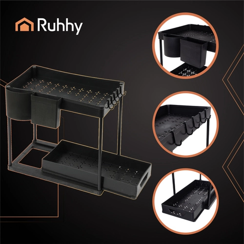Ieviesiet kārtību zem izlietnes un visā mājoklī ar praktisko 2 līmeņu Ruhhy organizatoru. Pateicoties izvelkamajiem plauktiem, kompaktajiem izmēriem un izturīgajai konstrukcijai no metāla un PP, jūs iegūsiet vairāk vietas un ērtu piekļuvi visām nepieciešamajām lietām. Elegantais melnais dizains iederēsies jebkurā virtuvē vai vannas istabā, un ātra montāža bez instrumentiem ietaupīs laiku.