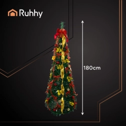 Aizmirstiet par ilgu rotāšanu – šis saliekamais Ziemassvētku koks RUHHY ir uzreiz gatavs un to izklāsiet vienas minūtes laikā. Tam ir 180 cm augstums, stabila pamatne un tas ir pilnībā izrotāts ar zelta lentēm, sarkanām bumbiņām un irbenes lapām, lai radītu tūlītēju svētku noskaņu jebkurā interjerā.