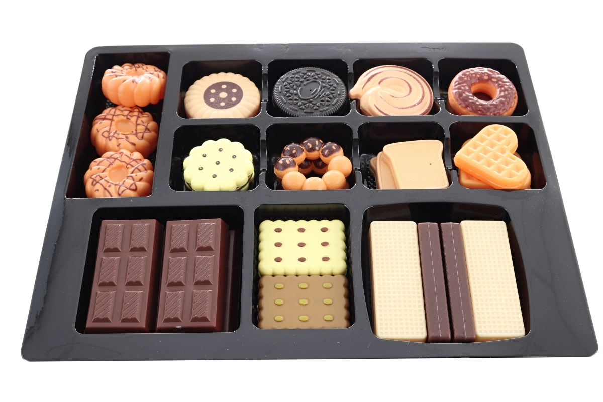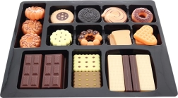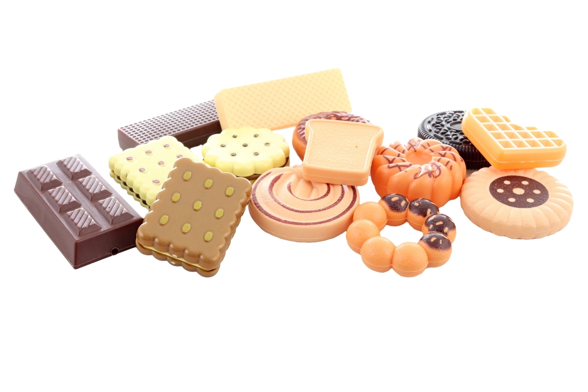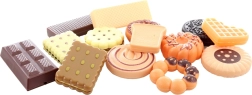 Izklaidējošs bērnu pārtikas komplekts ar vafelēm, cepumiem, šokolādi un vafelēm no kvalitatīvas plastmasas. Lieliski piemērots spēlēm virtuvē, attīsta iztēli un sociālās prasmes. Piegādāts dāvanu kastītē. Piemērots bērniem no 3 gadu vecuma.