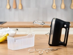 Komplektā ir putošanas slotiņas un mīklas āķi. Caurspīdīgā kaste uztur visu kopā un gatavu lietošanai.