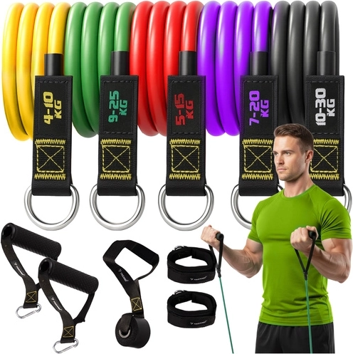 Pilns TRIZAND pretestības gumiju komplekts efektīviem treniņiem mājās un sporta zālē. Ietver 5 lentes ar slodzi 4–30 kg, roku rokturus, potīšu siksnas, durvju enkurīti un somiņu. Pateicoties izturīgam lateksam, augstai elastībai un pretizslīdes rokturiem, droši varat trenēt visu ķermeni – muguru, rokas, kājas, vēderu un sēžas muskuļus.
