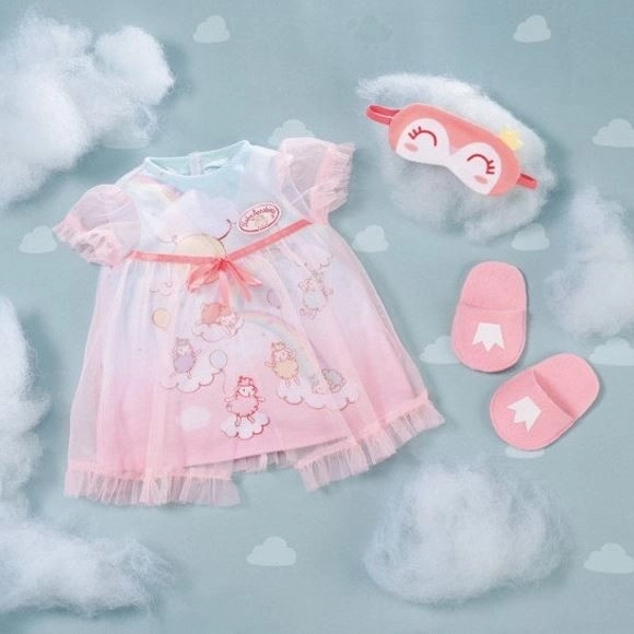 Ar šo naktskreklu Baby Annabell jūtas kā uz mākonīša. Pateicoties tilla virsbikses svārciņiem un jautrajiem aitiņu motīviem, jūsu lellei patiks viegli iemigt katru nakti. Vakara rituālu papildina arī mīlīga miega maska un čībiņas, kuras ir viegli noņemt.