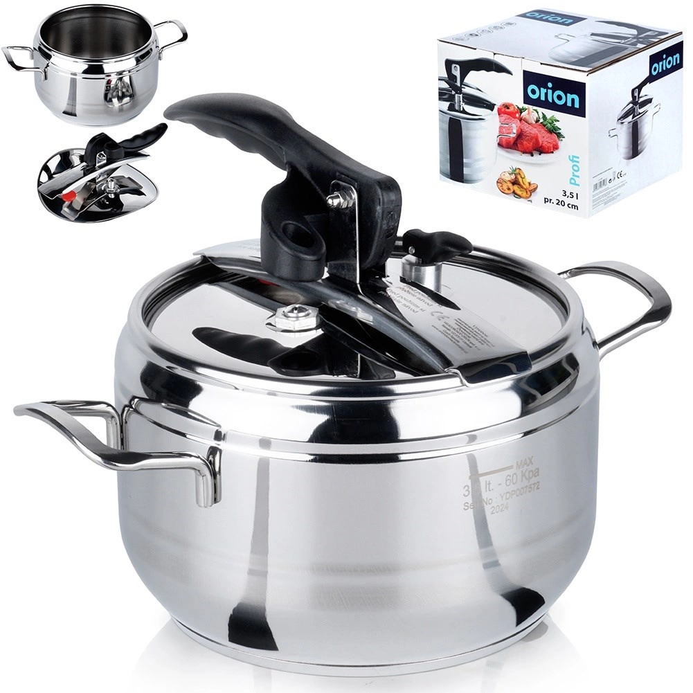 Spiediena katls Profi 3,5 l ir uzticams palīgs ikdienas gatavošanai. Augsta kvalitāte no nerūsējošā tērauda, droša aizdare un drošības elementi nodrošina drošu lietošanu, savukārt gatavošana zem spiediena būtiski saīsina pagatavošanas laiku un enerģijas patēriņu. Kopējais tilpums ir 3,5 l; ieteicamais darba tilpums ir aptuveni 2/3.