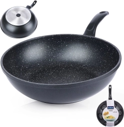 Ergonomiskais rokturis paliek auksts pieskaroties un nodrošina drošu satvērienu. Pateicoties universālai saderībai ar visiem plīšu tipiem, tostarp indukciju, un iespējai mazgāt trauku mazgājamajā mašīnā, vokpanna ir praktisks palīgs ikdienas gatavošanai. Laikmetīgs izskats ar granīta/“akmens” struktūru stilīgi papildinās jūsu virtuvi.