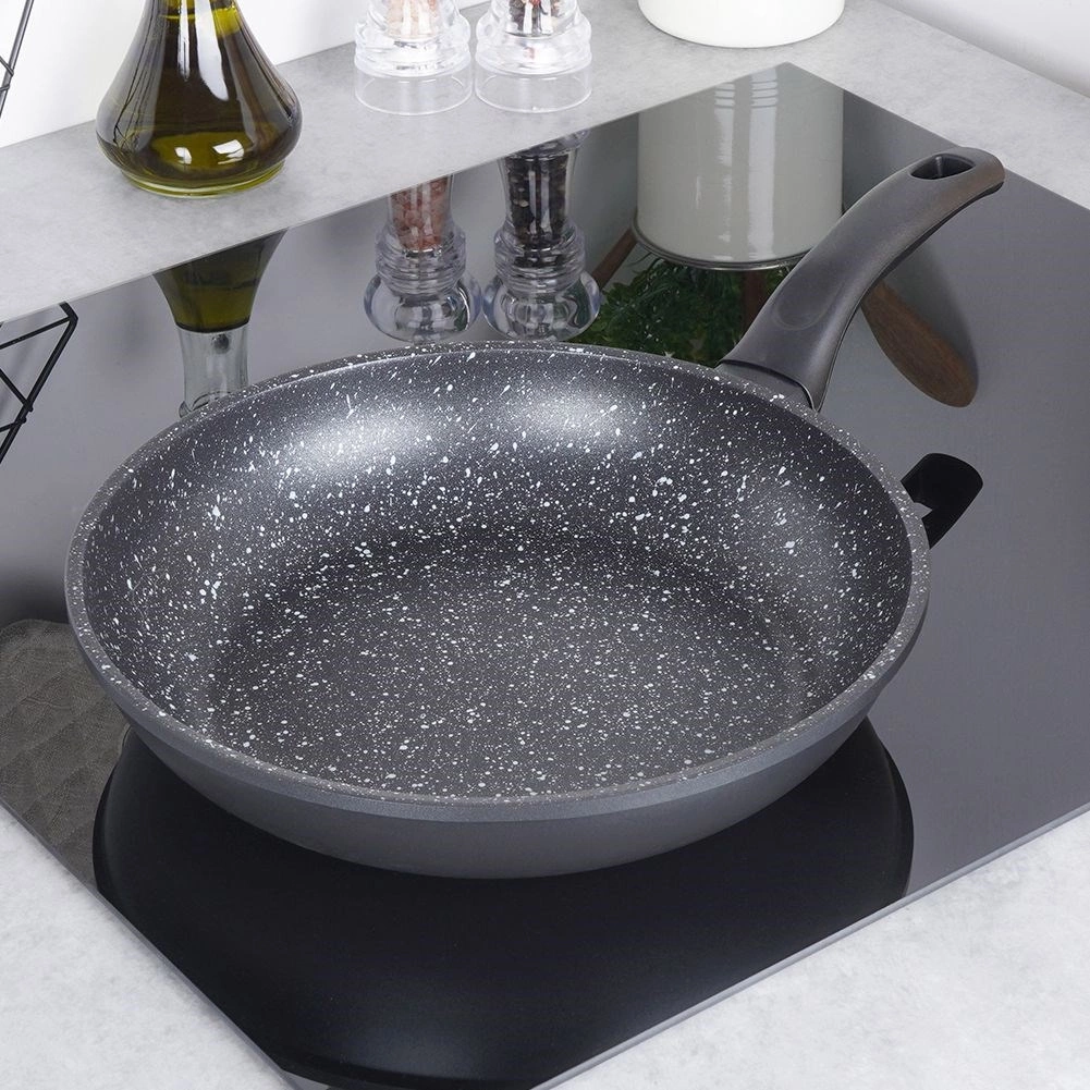 Izturīga granīta panna ar 28 cm diametru ikdienas cepšanai un sautēšanai. Pateicoties nelīpošai granīta pārklājuma virsmai bez PFOA un PTFE, ēdienu var gatavot ar minimālu tauku daudzumu, siltums vienmērīgi izkliedējas un panna ir piemērota visiem plīšu veidiem, tostarp indukcijai. Ergonomiskais rokturis neuzkarst, un pannu var mazgāt trauku mazgājamajā mašīnā.