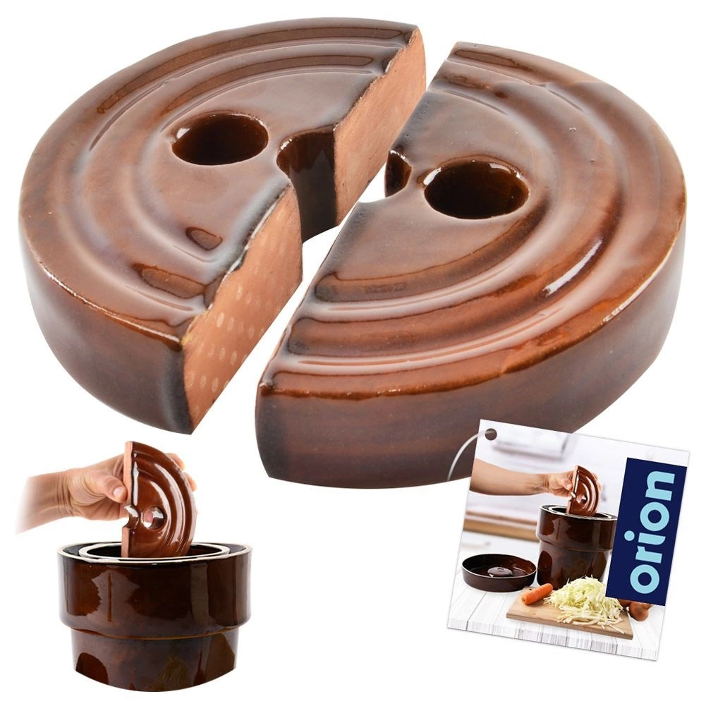 Praktisks keramikas svars fermentēšanai ar 21 cm diametru uztur dārzeņus droši pilnībā iegremdētus sālījumā vienmērīgai fermentācijai bez pelējuma. Izturīga keramika brūnā glazūrā, divdaļīgs izpildījums ar atverēm ērtai ielikšanai un izņemšanai. Ideāli piemērots skābētiem kāpostiem, marinētiem gurķiem un citiem dārzeņiem fermentēšanas traukos un podos.