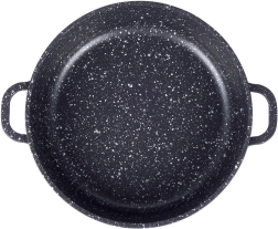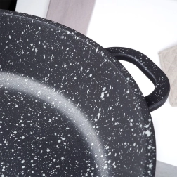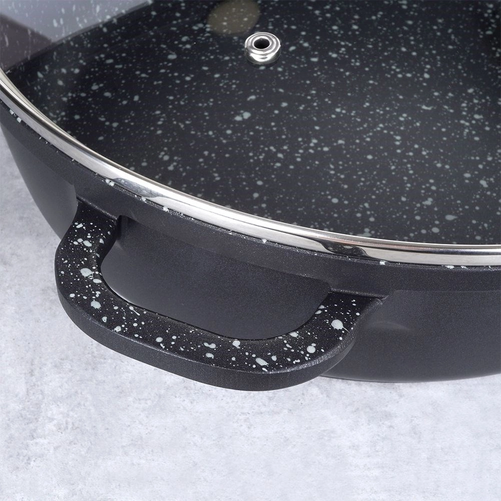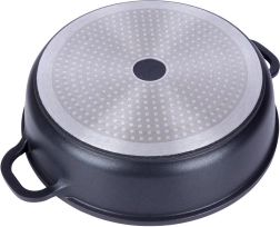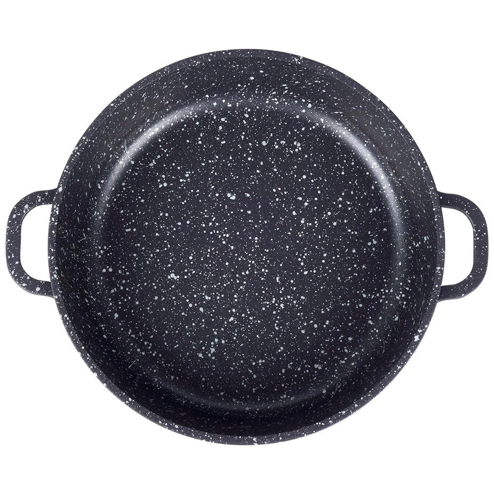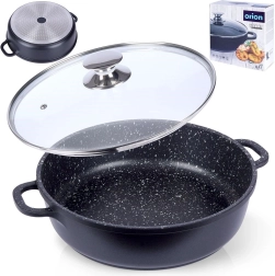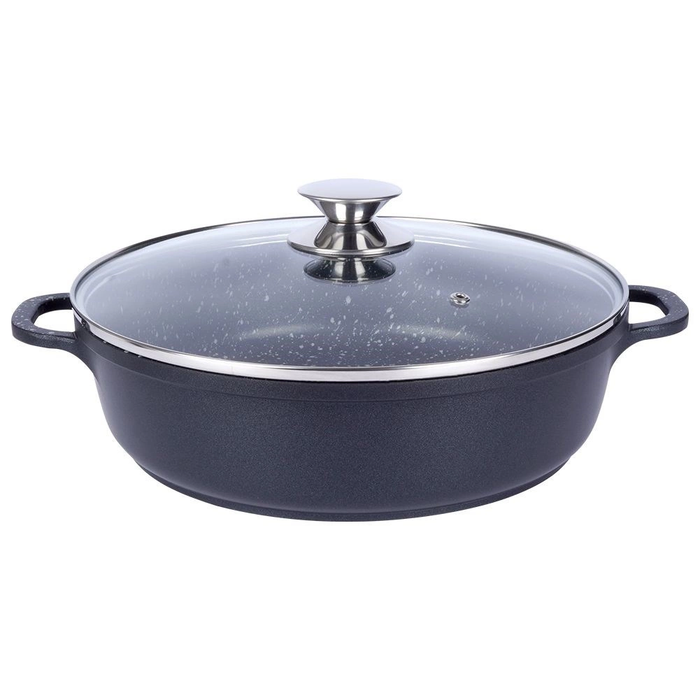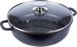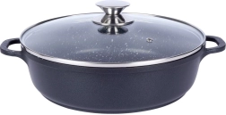 Robusta alumīnija panna elegantā melnā izpildījumā ar akmens izskatu ir aprīkota ar augstas kvalitātes granitveida nelīpošo PFLUON pārklājumu, kas iztur augstu temperatūru un skrāpējumus. Stikla vāks ar nerūsējoša tērauda malu un tvaika ventili atvieglo gatavojamā ēdiena kontroli un saglabā mitrumu sulīgiem rezultātiem.